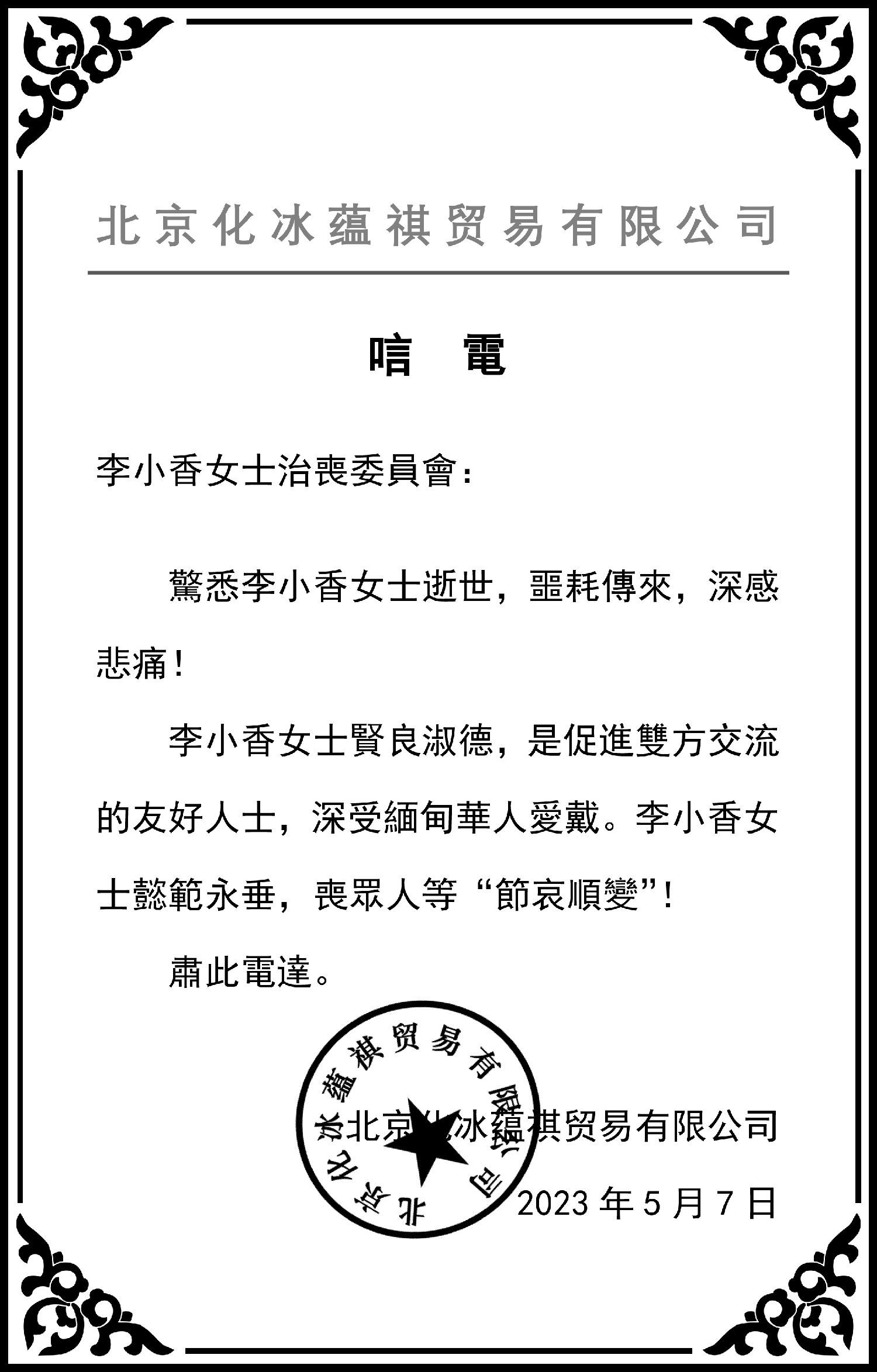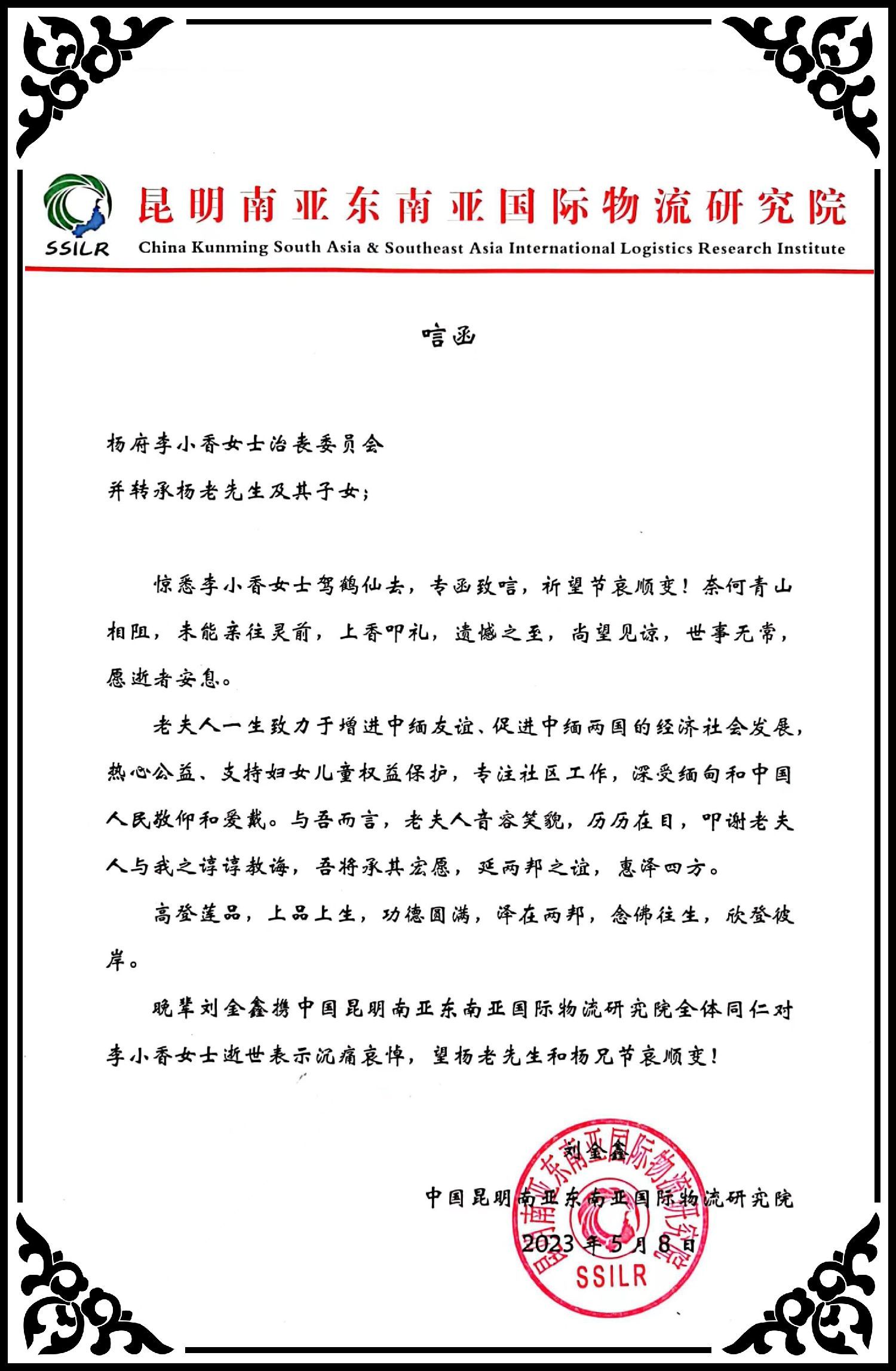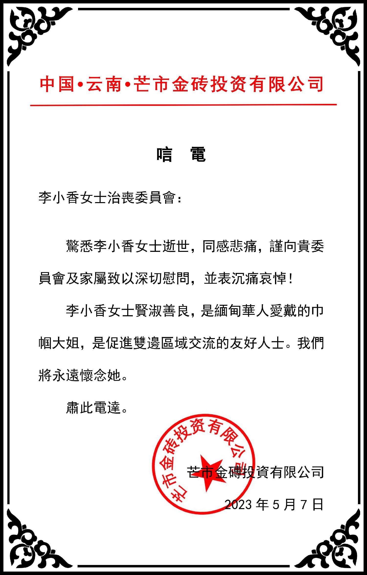 芒市金砖公司、北京化冰蕴祺公司、昆明南亚东南亚国际物流研究院等亲朋好友纷纷致电,对李小香女士的逝世表示哀悼!