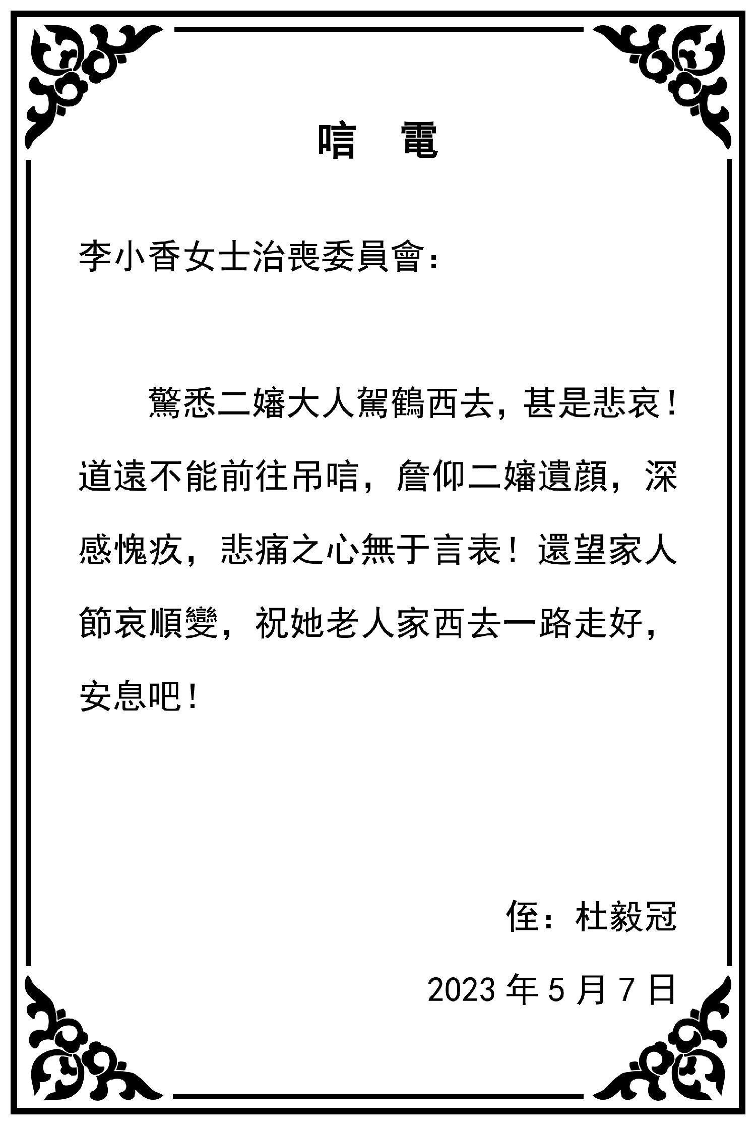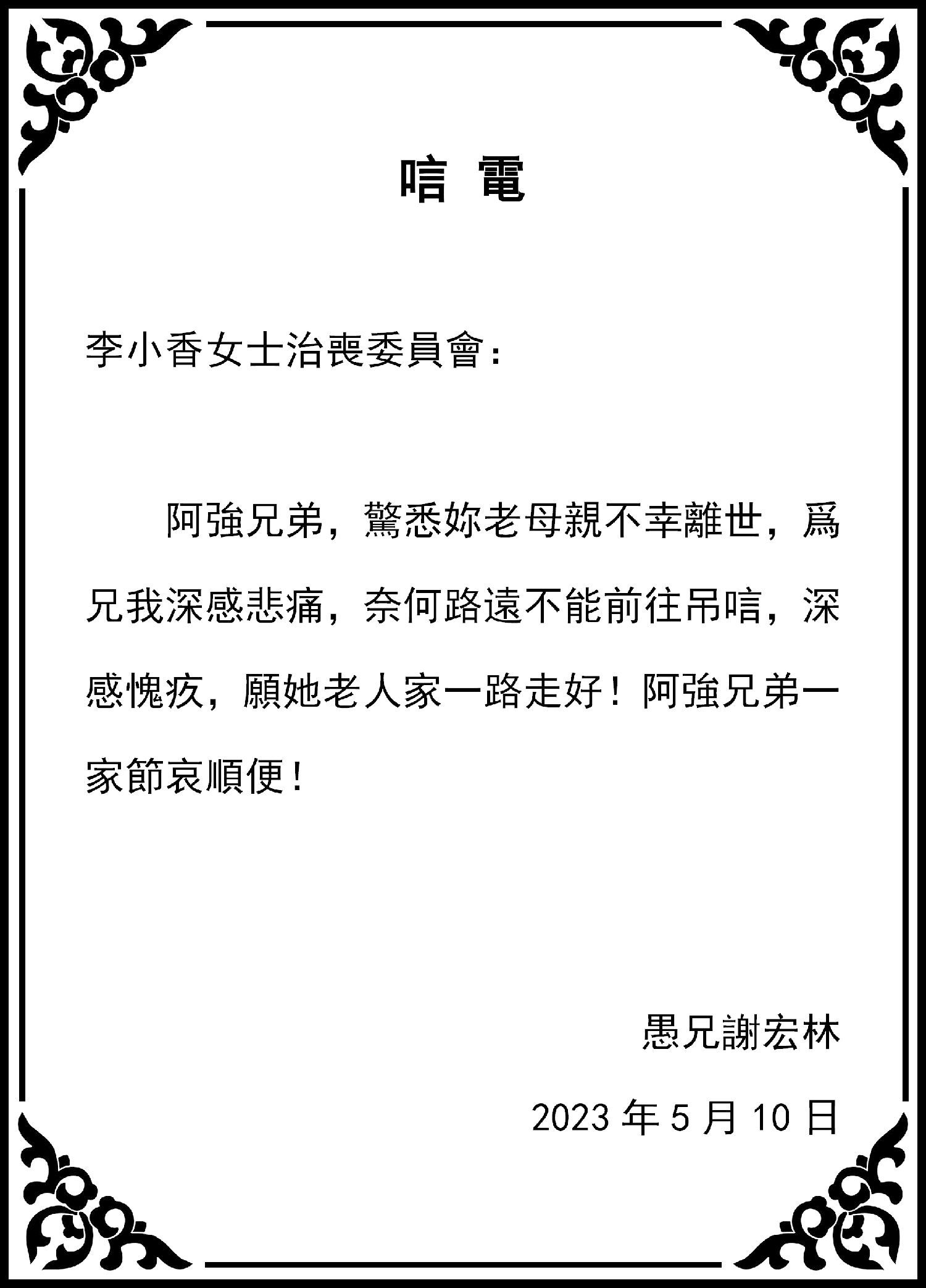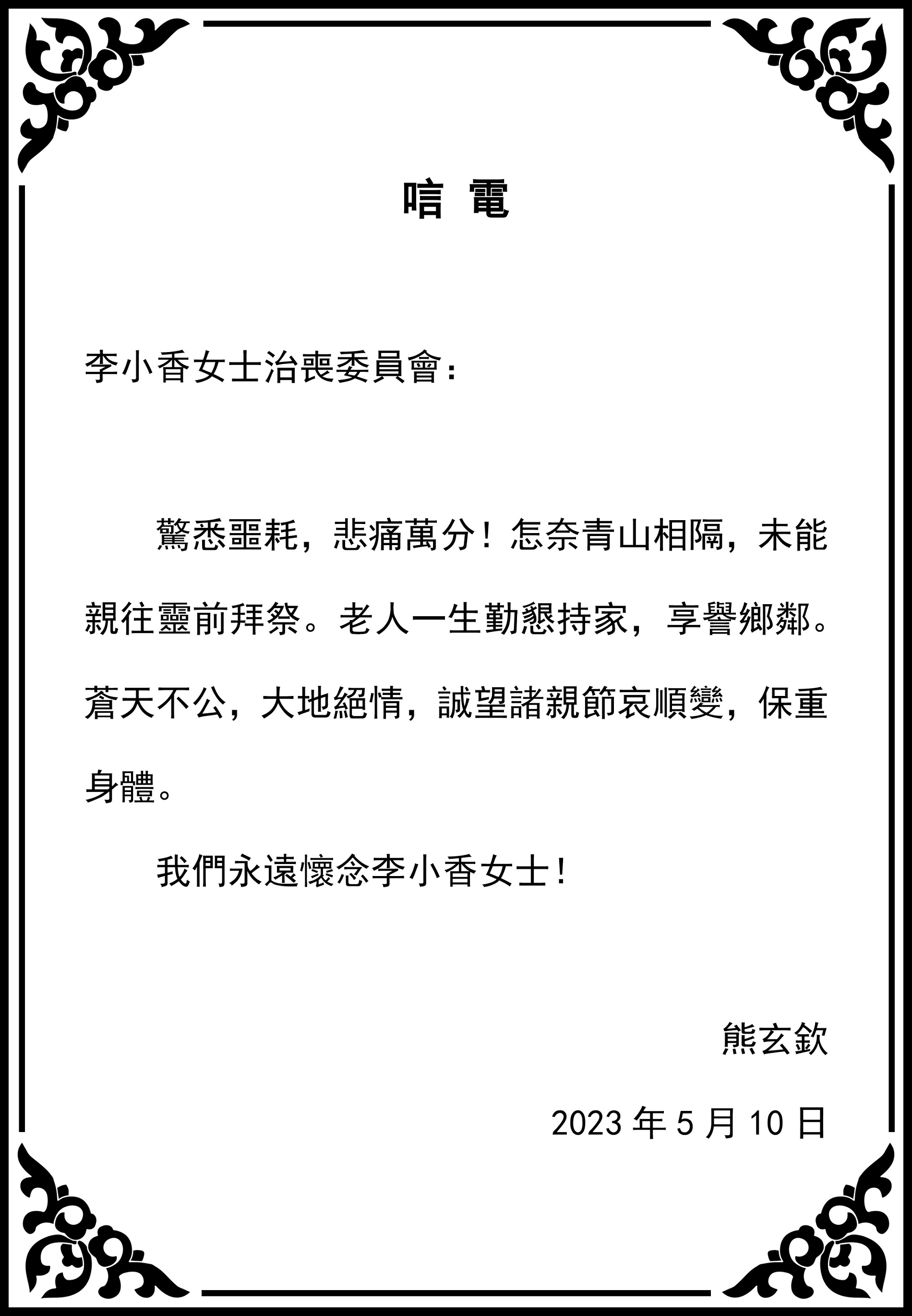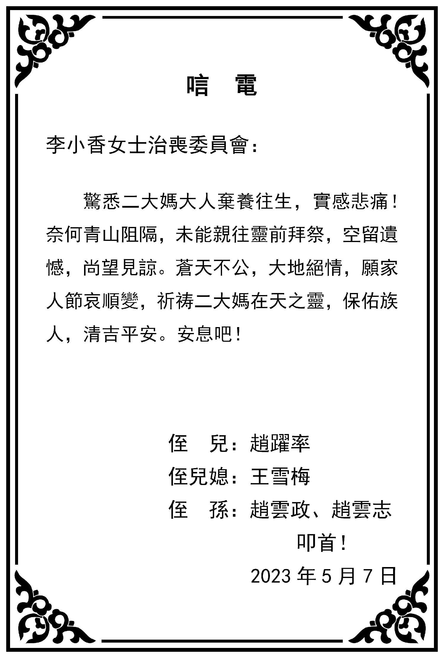 芒市金砖公司、北京化冰蕴祺公司、昆明南亚东南亚国际物流研究院等亲朋好友纷纷致电,对李小香女士的逝世表示哀悼!