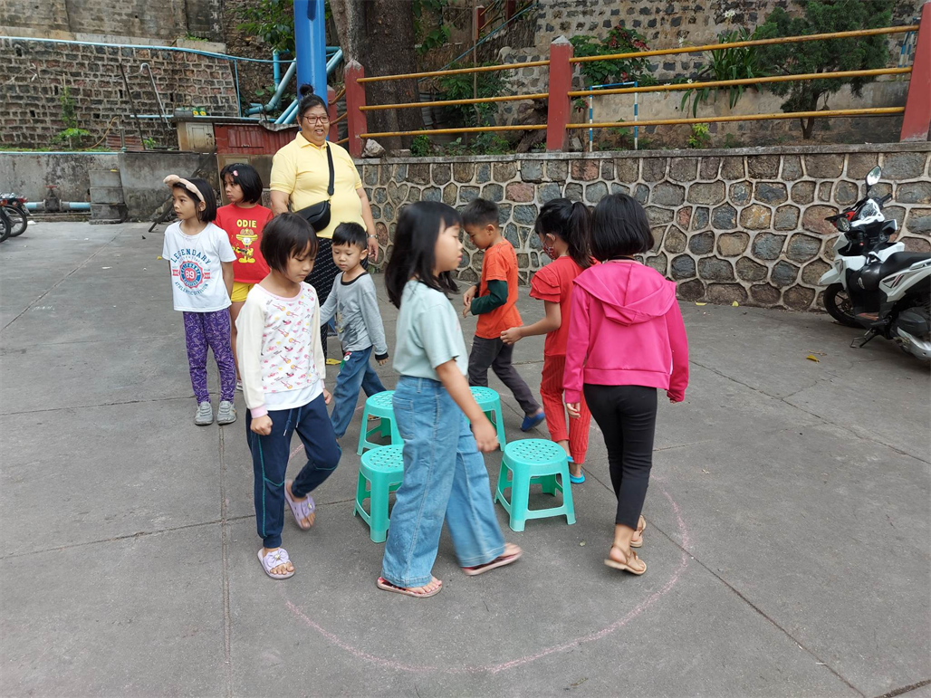 开音乐抢板凳游戏是根据其规则,人数比凳子多一个,当音乐停止时,没有抢到凳子的人就会被淘汰,体现了学生们的灵活能力。