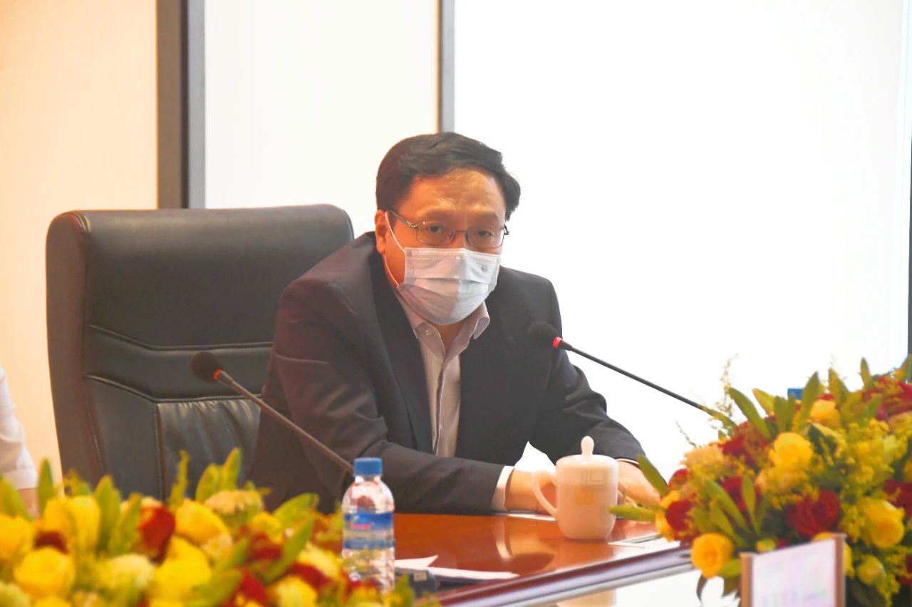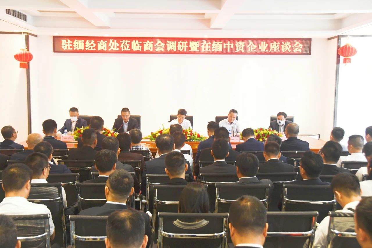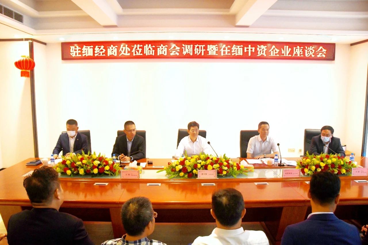5月30日下午,中国驻缅甸大使馆经济商务处谭书富参赞和欧阳道冰参赞一行到仰光缅甸中国企业商会调研并出席在缅中资企业座谈会。缅甸中国企业商会会长刘铭、荣誉会长刘颖、常务副会长姚凤刚、商会会员单位和各地方商会代表约120人通过线上线下参加座谈会。