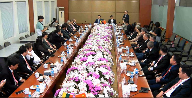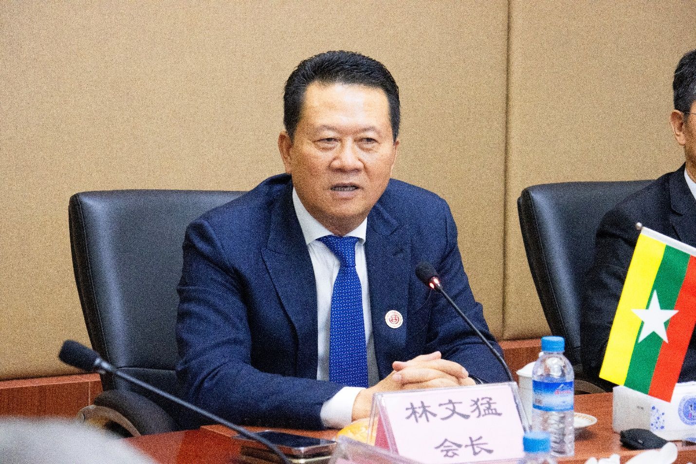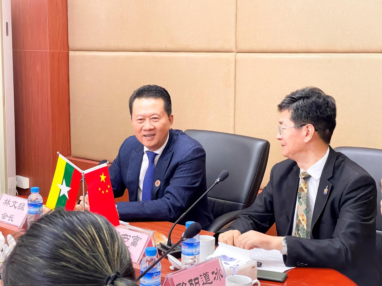 林文猛会长介绍了商会有着114周年的悠久历史。商会以团结服务社会,服务侨胞弘扬华商精神,热心慈善公益与教育。以促进经贸合作,增进中缅友谊搭建沟通桥梁为己任。赢得了中缅两国政府广大华侨华人的信任和支持。商会汇聚了各行业领域的精英翘楚为推动中缅友好往来和社会发展贡献力量。缅甸与中国自古以来地缘近,人缘亲,山水相连,唇齿相宜,人民之间亲密往来,通商贸易,历史悠久,侨居缅甸的华侨华商发扬着中华民族勤劳勇敢奋斗的优秀文化传统,世世代代与缅甸人民一道披荆斩棘,栉风沐雨,劳动生息,落地生根为侨居地的经济文化繁荣建设,作出了卓越的贡献。
