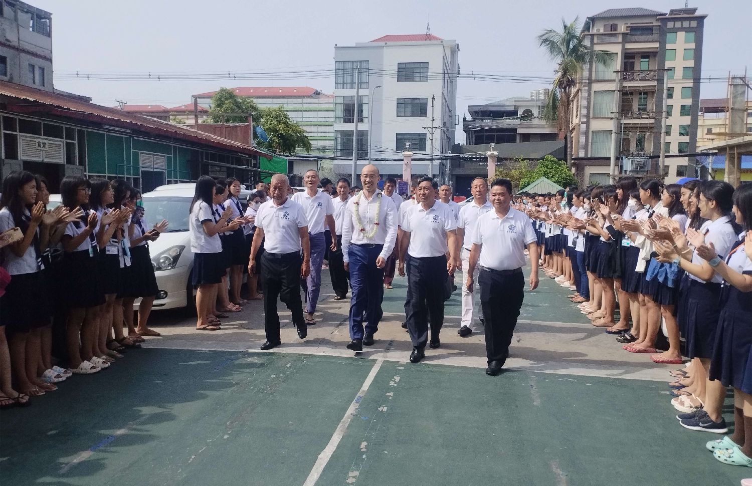 孔教学校总校长杜鸿昌先生,监事长寸得仲先生,副董事长兼副校长赵德钧先生、副董事长兼副校长尚朝将先生,副董事长毛富佑先生、副董事长兼秘书长冷煜东先生,董事会代表董事等校领导以及东校区全体老师、学生们,列队热烈欢迎张巍代总领事一行莅临指导。