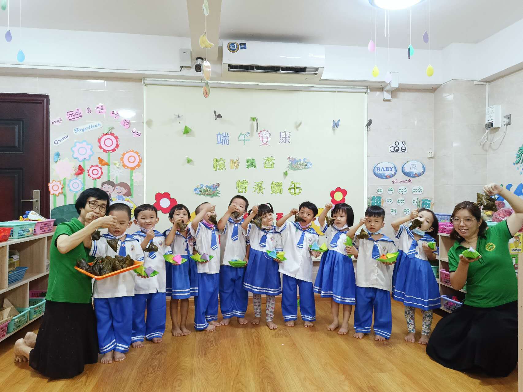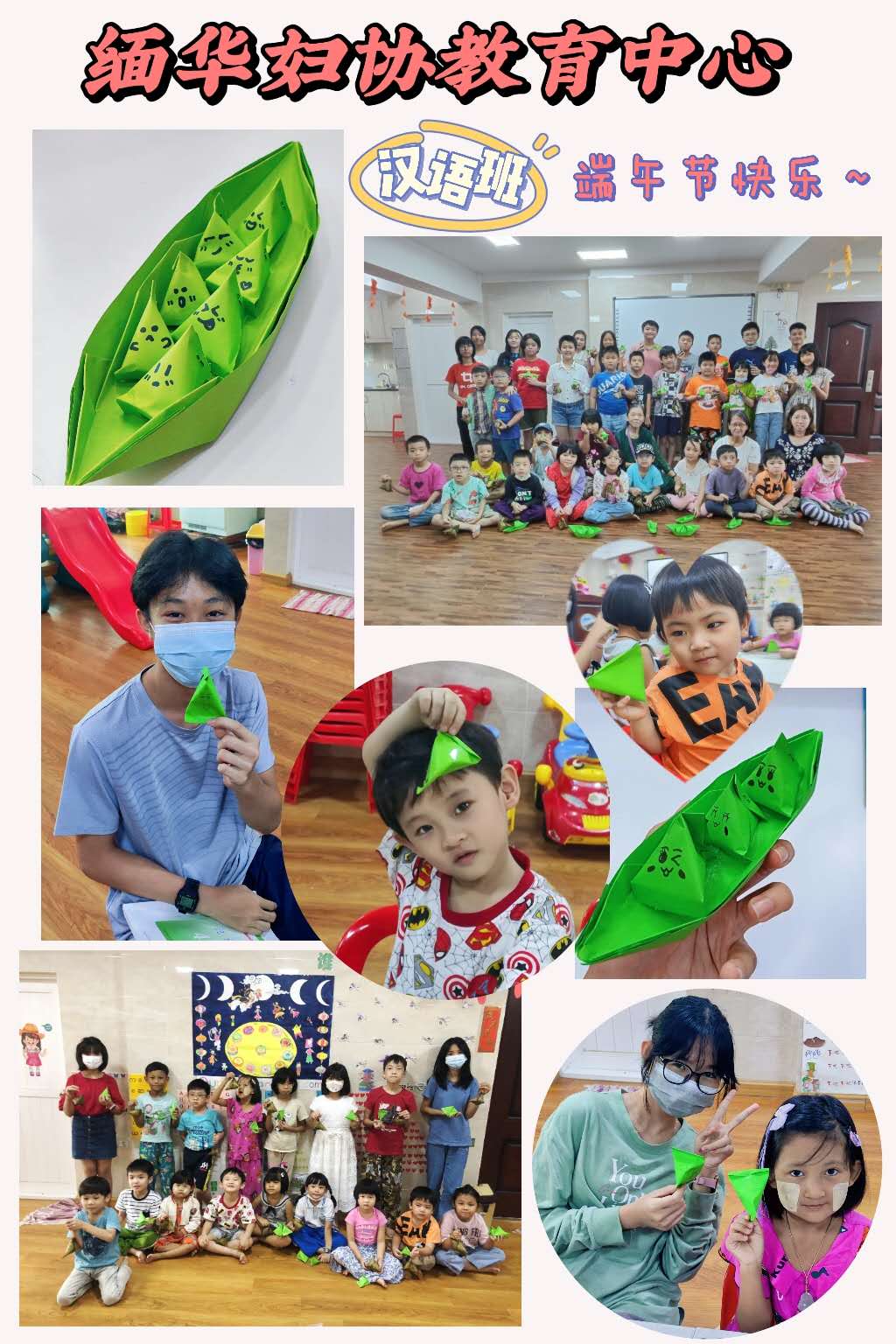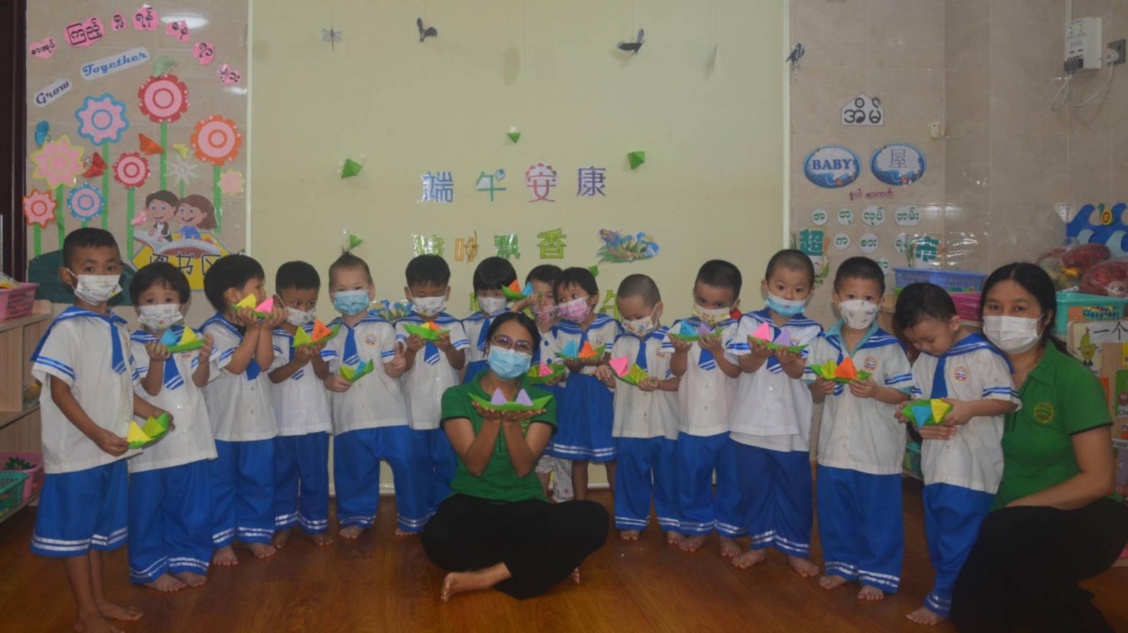 2023年6月22日端午节当天,缅华妇协教育中心幼儿园为庆祝传统佳节端午节,开展了手工折纸活动。通过本次活动幼儿们认识到了,端午节就有小粽子吃。