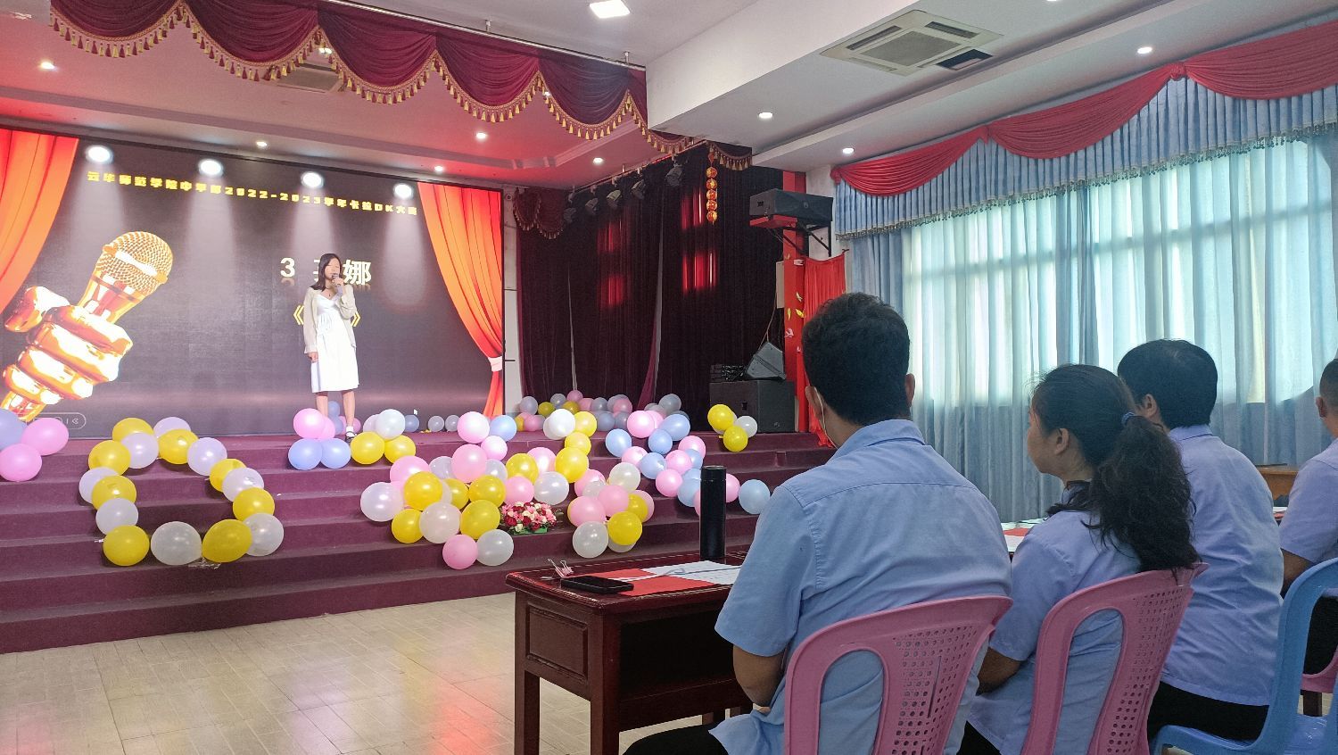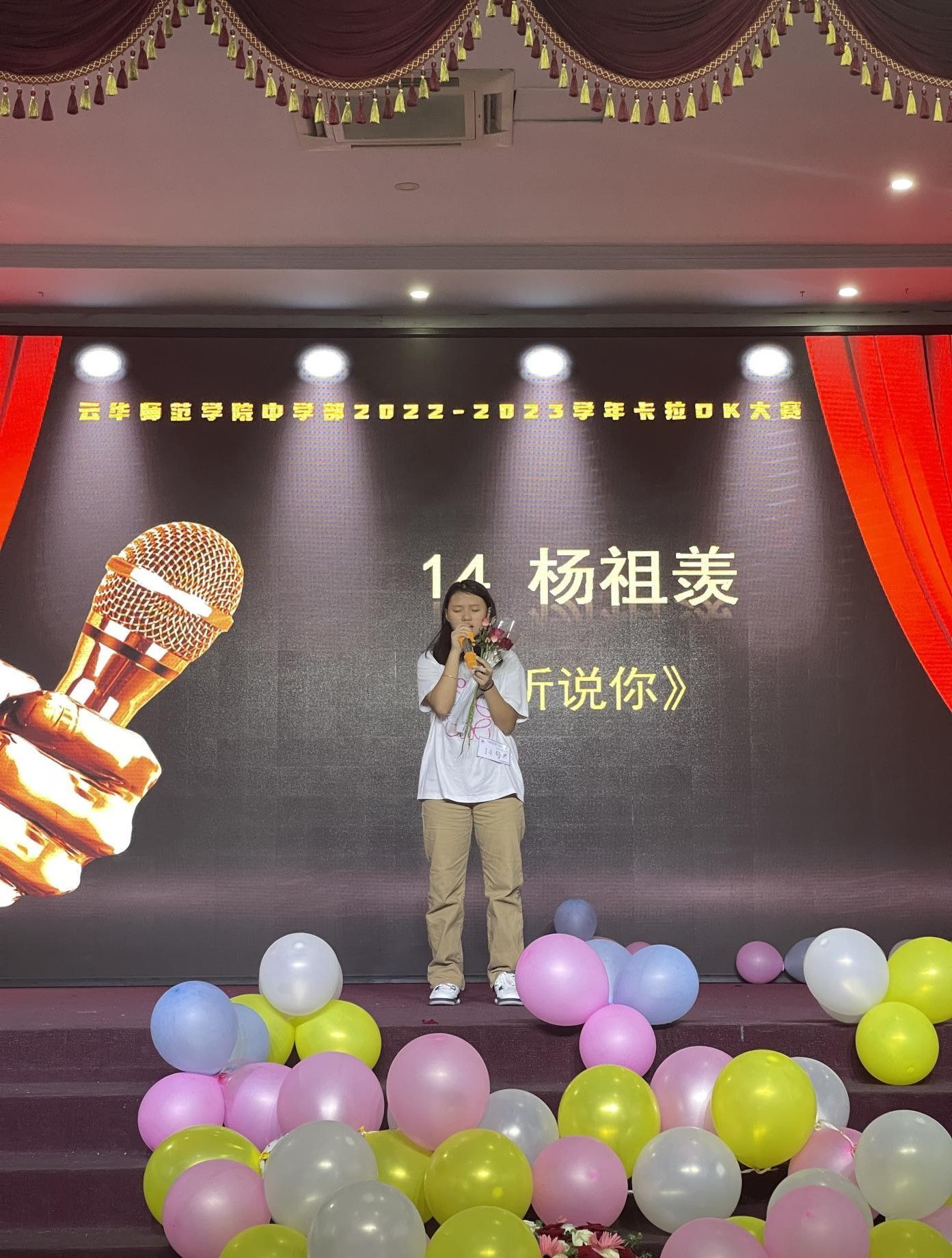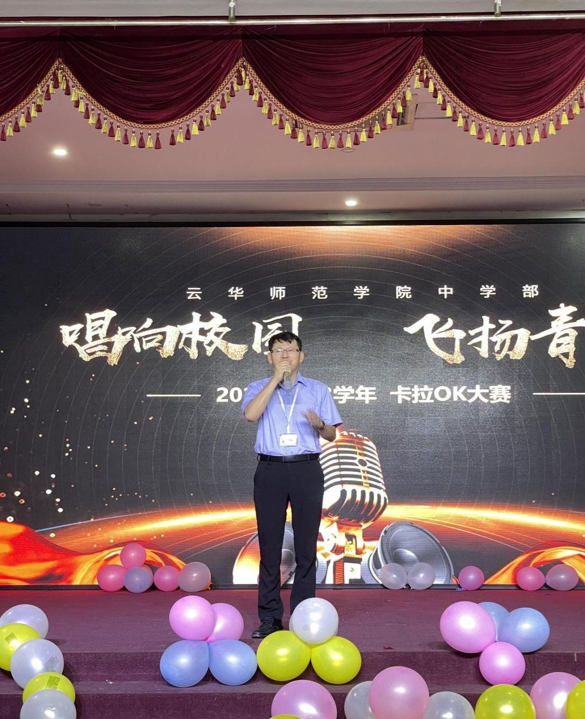 云华师范学院中学部于6月17日早上在学校礼堂成功举办了主题为“唱响校园,飞扬青春”的学生卡拉OK大赛。本次活动共有22位同学参赛,他们以嘹亮的歌声和精彩的表演赢得了观众的热烈掌声,活动在余音绕梁中完美落幕。