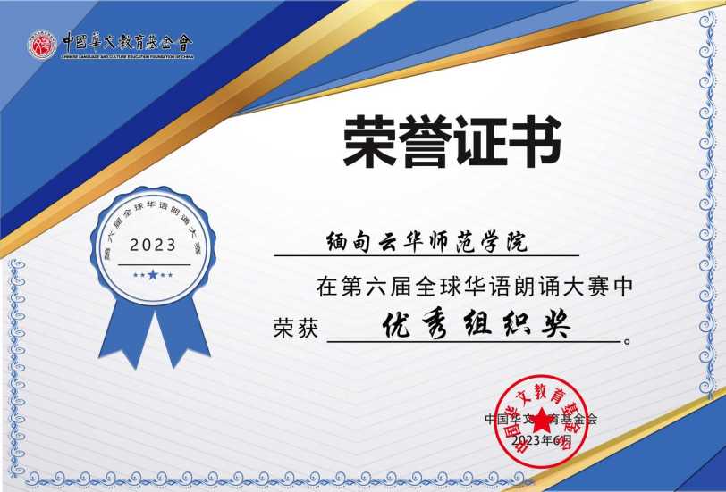 作为第六届全球华语朗诵大赛缅甸赛区的协办单位,云华师范学院从比赛场地、教师团队、后勤服务等方面保障了此次比赛的有序开展。决赛后,学院获得了中国华文教育基金会组织方的认可,并被授予了“优秀组织奖”的称号,这意味着学院工作将迈上新台阶、再创新辉煌!