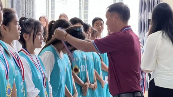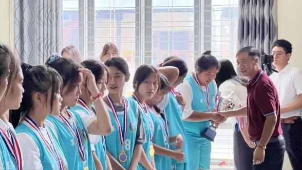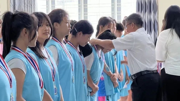 李绍清监事长为女子组冠军果文球队颁发奖杯奖金,并为运动员佩戴奖牌。▼