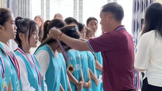 赵仁发副董事长为女子组季军明德球队颁发奖杯奖金,并为运动员佩戴奖牌。▼