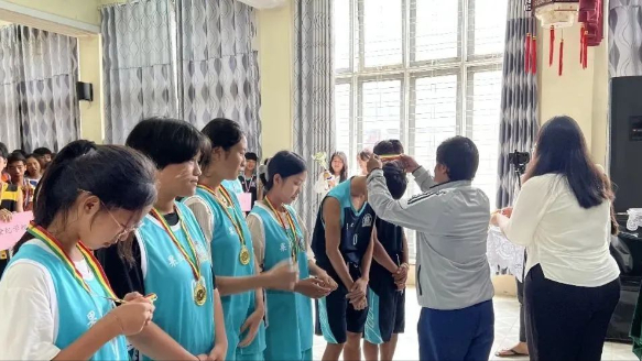 腊戌市体育长为男子组季军新世纪球队颁发奖杯奖金,并为运动员佩戴奖牌。▼
