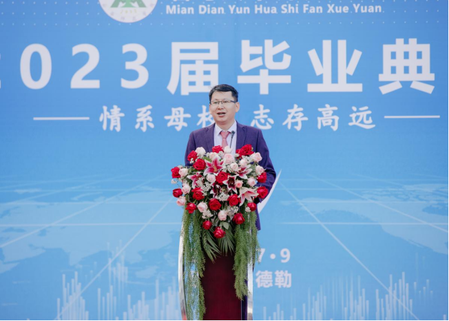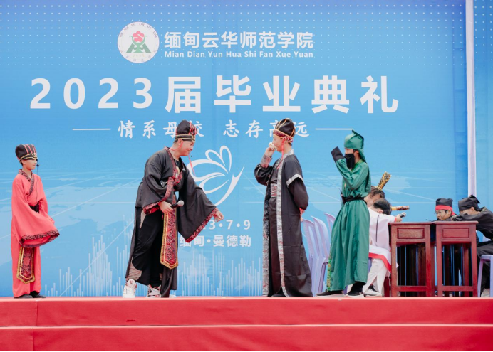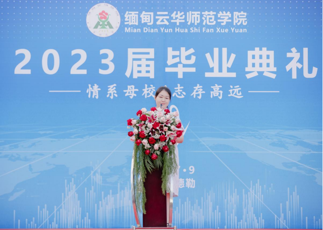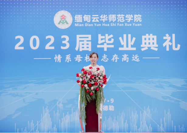 中华人民共和国驻曼德勒总领事馆孟庆星领事代表陈辰总领事及总领事馆表达了对毕业生们的祝福,孟领事表示,他曾多次到访云华,云华的师生让他印象深刻,由总领事馆和云华师范学院合作的项目与举办的活动也取得了良好的社会反响,他认为,云华师范学院充分发挥了华校作为中缅交流的文化桥梁作用,希望毕(结)业的学子在未来能够继续不忘初心,努力前行,在成就自己的同时,不忘做好中缅文化交流的使者。