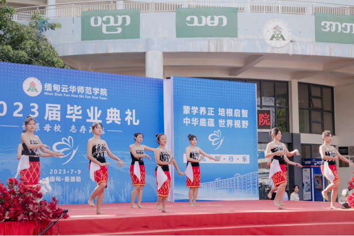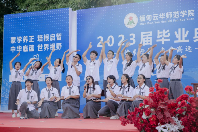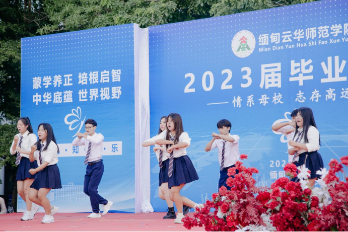 在师范部22班结业生的合唱《凤凰花开的路口》里,我们看到了他们在云华的每一个脚印和每一份温馨,来日方长,同学和母校的祝福永伴左右。师范部舞蹈社的同学们为观众带来了青春灵动的《景颇族舞蹈》,这是师范部学子对于母校的深深祝福,也是母校对于全体云华学子的热情嘱托,这帮即将结业的师范生,一定会将华教的种子撒往缅甸的各个角落。