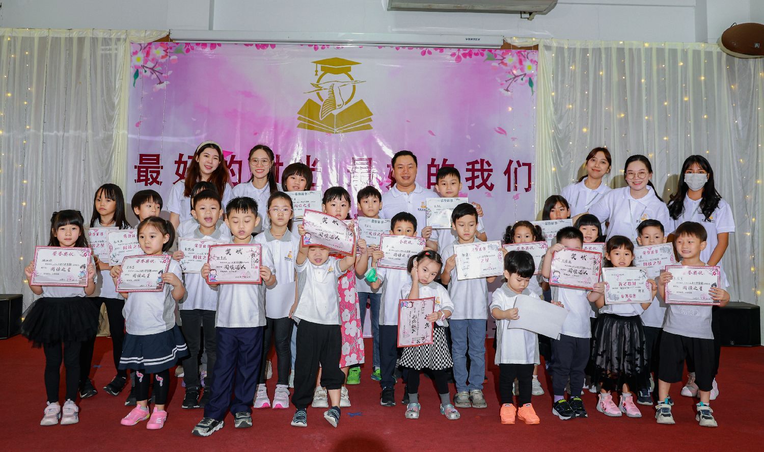 紧接着,黄涛涛老师、熊婉冰老师和陆月宝老师分别为大班、中班和小班的小朋友们颁发了荣誉奖状,表彰他们在学习和表现方面的优秀表现。