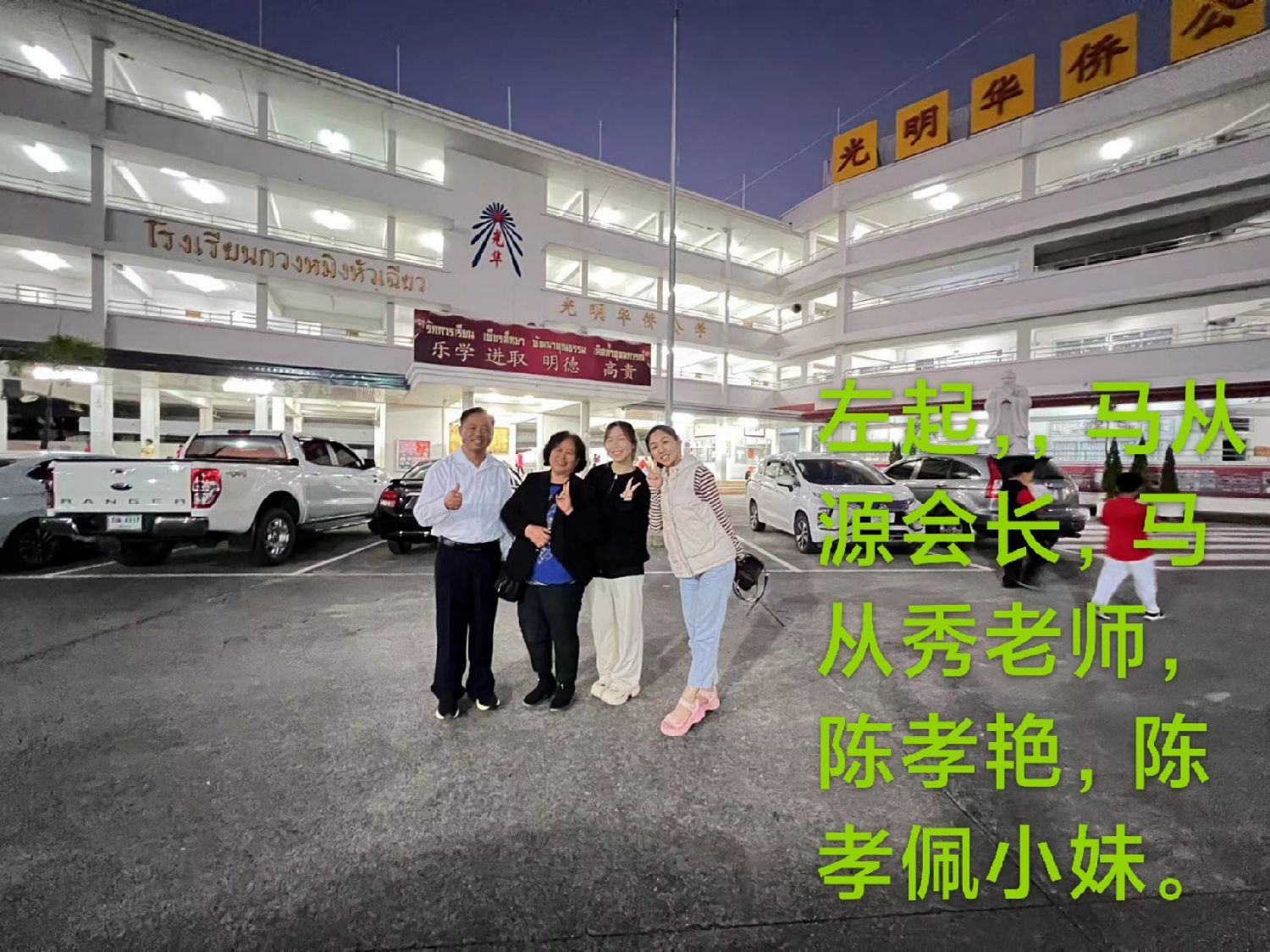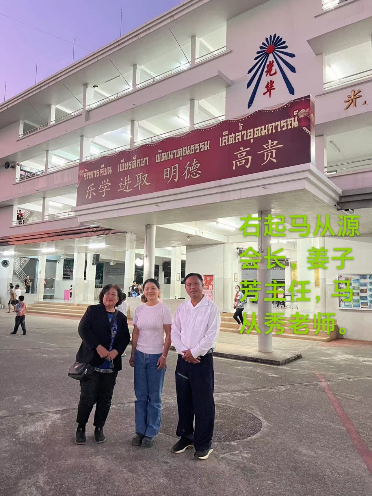 2023年12月28日下午五点半,缅甸郊区华校互助会会长马从源,曼德勒马从秀老师。在美赛陈孝佩,陈孝艳两位小妹陪同下参访了美赛光明华侨公立学校。得到了武凤珠校长,姜子芳主任,符青芳,李光菊老师等热情接待。大家共同交流两地华文教育情况,据了解:光明学校有1200多位学生,47位老师,办学15年时间,分别使用汉语教材与人教版教材,上课时间:周一到周五17:30-19:50,周六09:00-12:00。