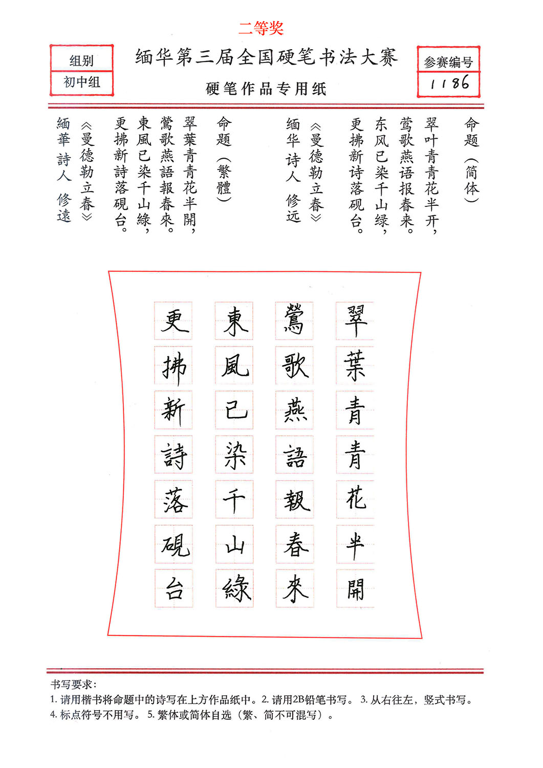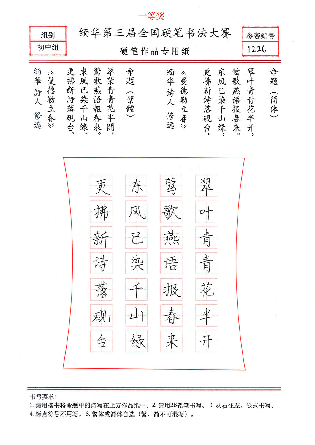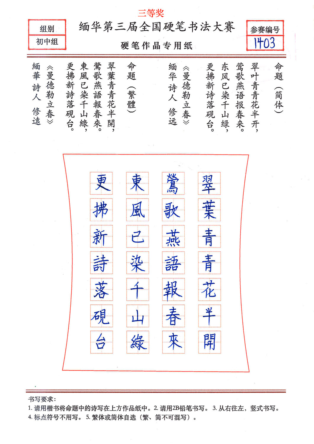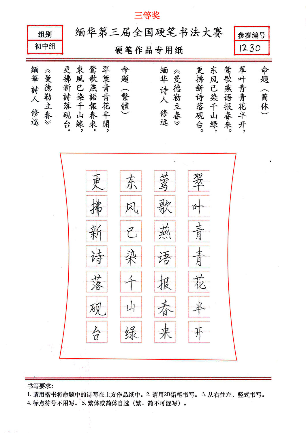 缅华第三届全国硬笔书法大赛获奖作品选登——初中组