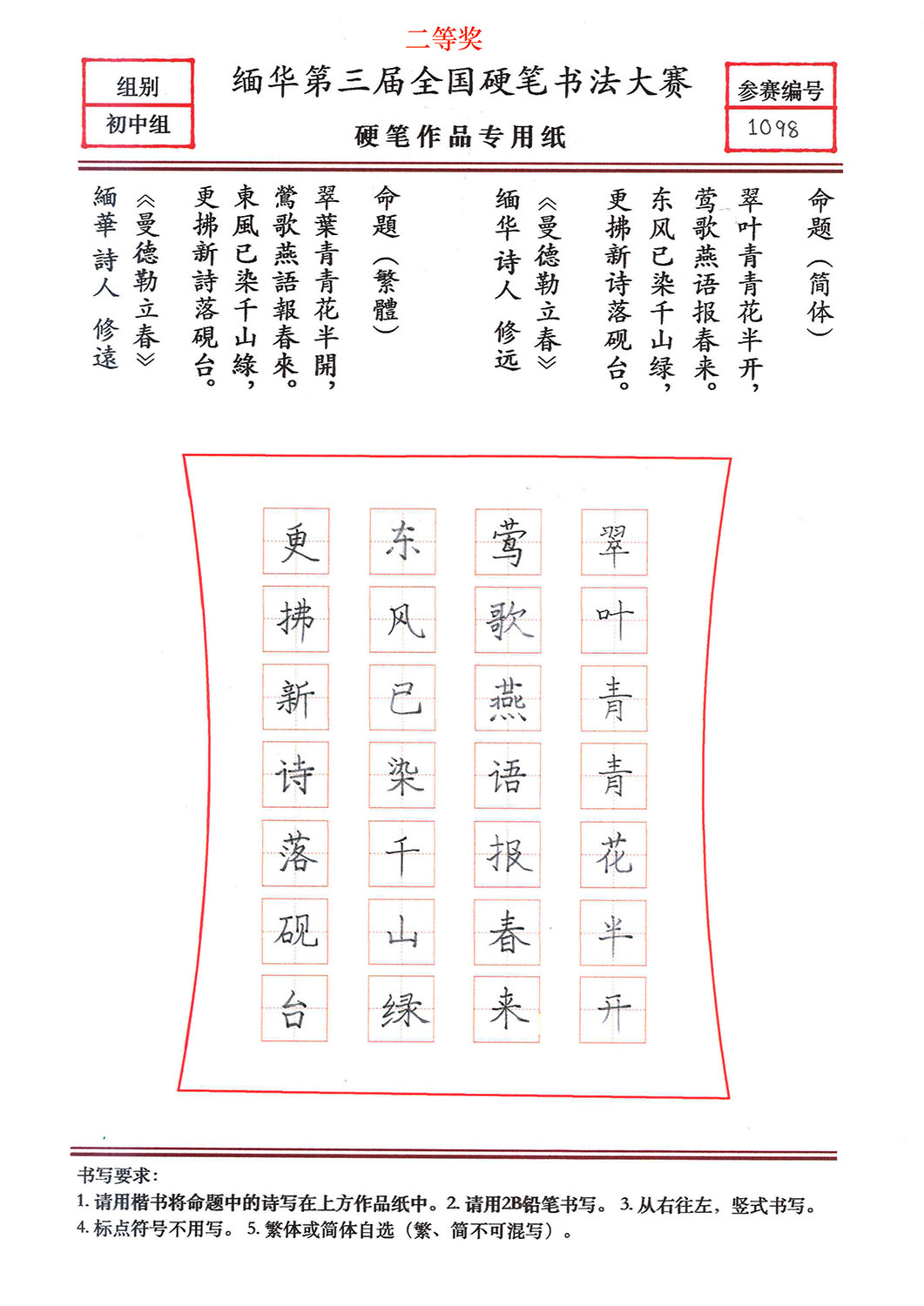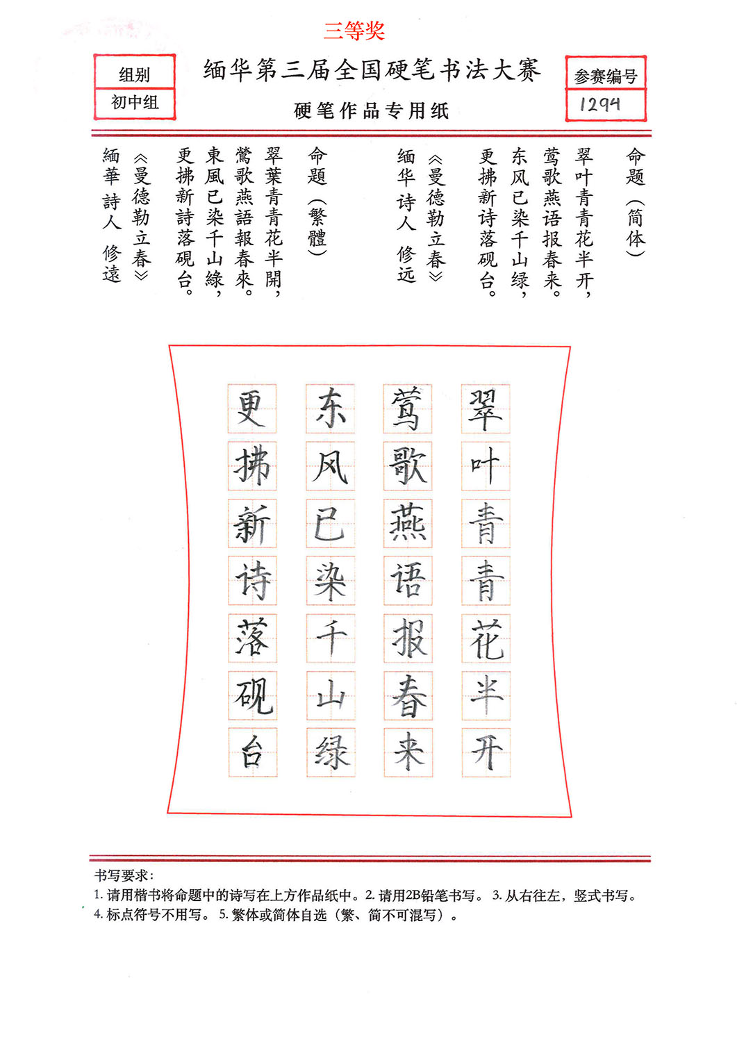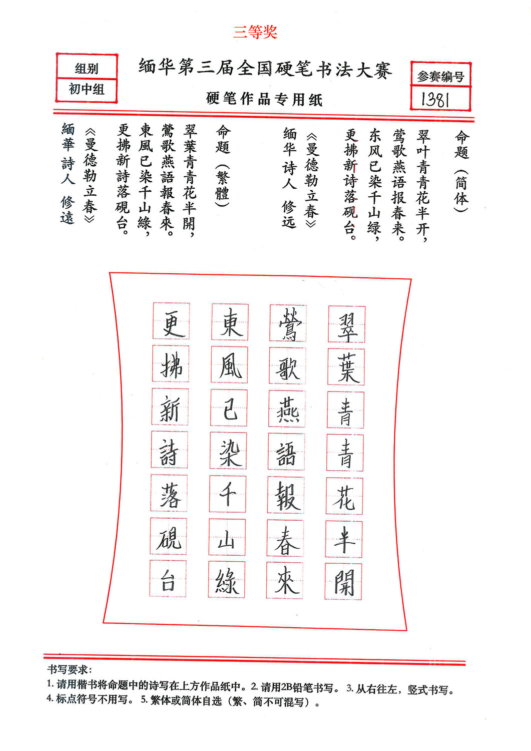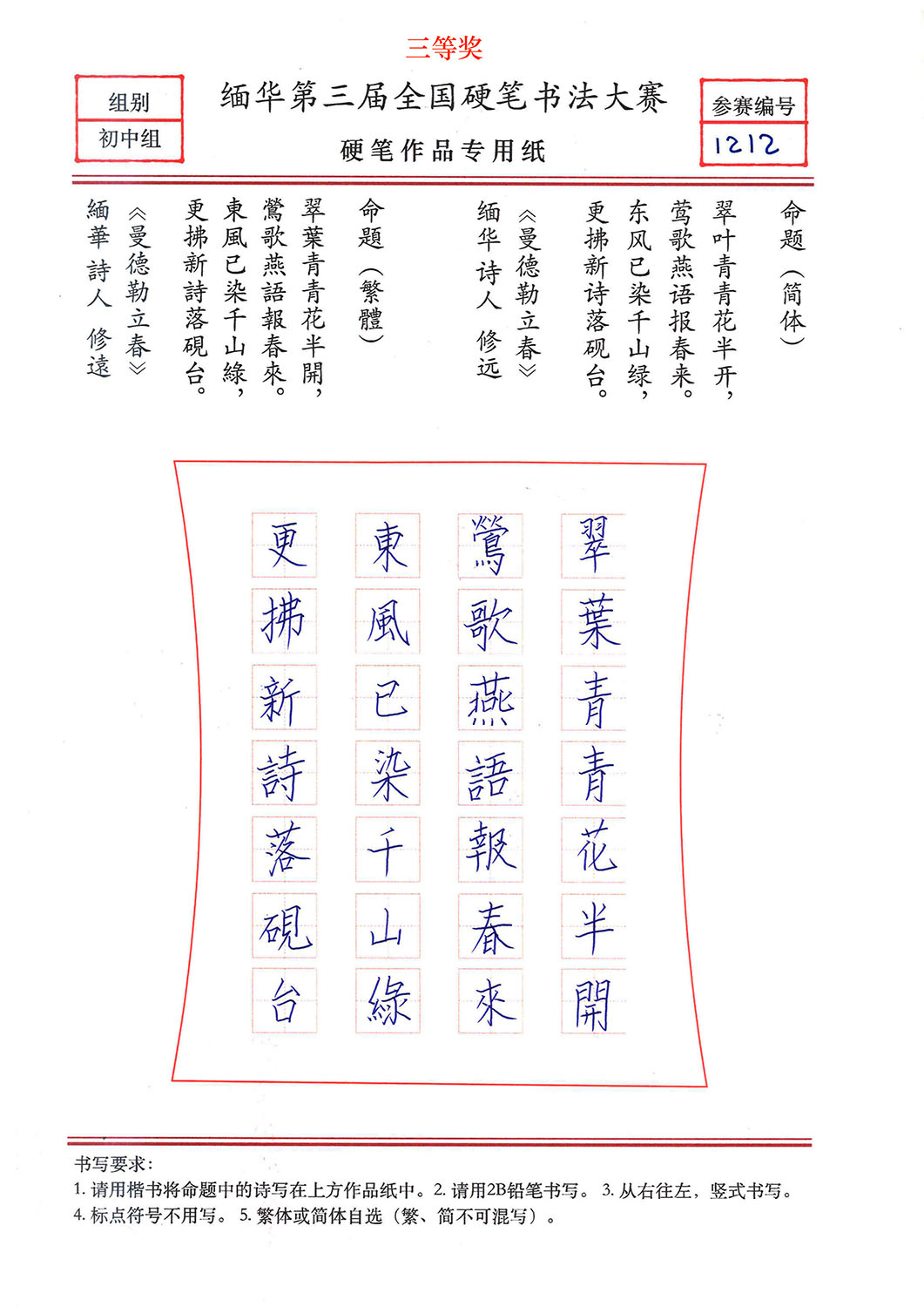 缅华第三届全国硬笔书法大赛获奖作品选登——初中组