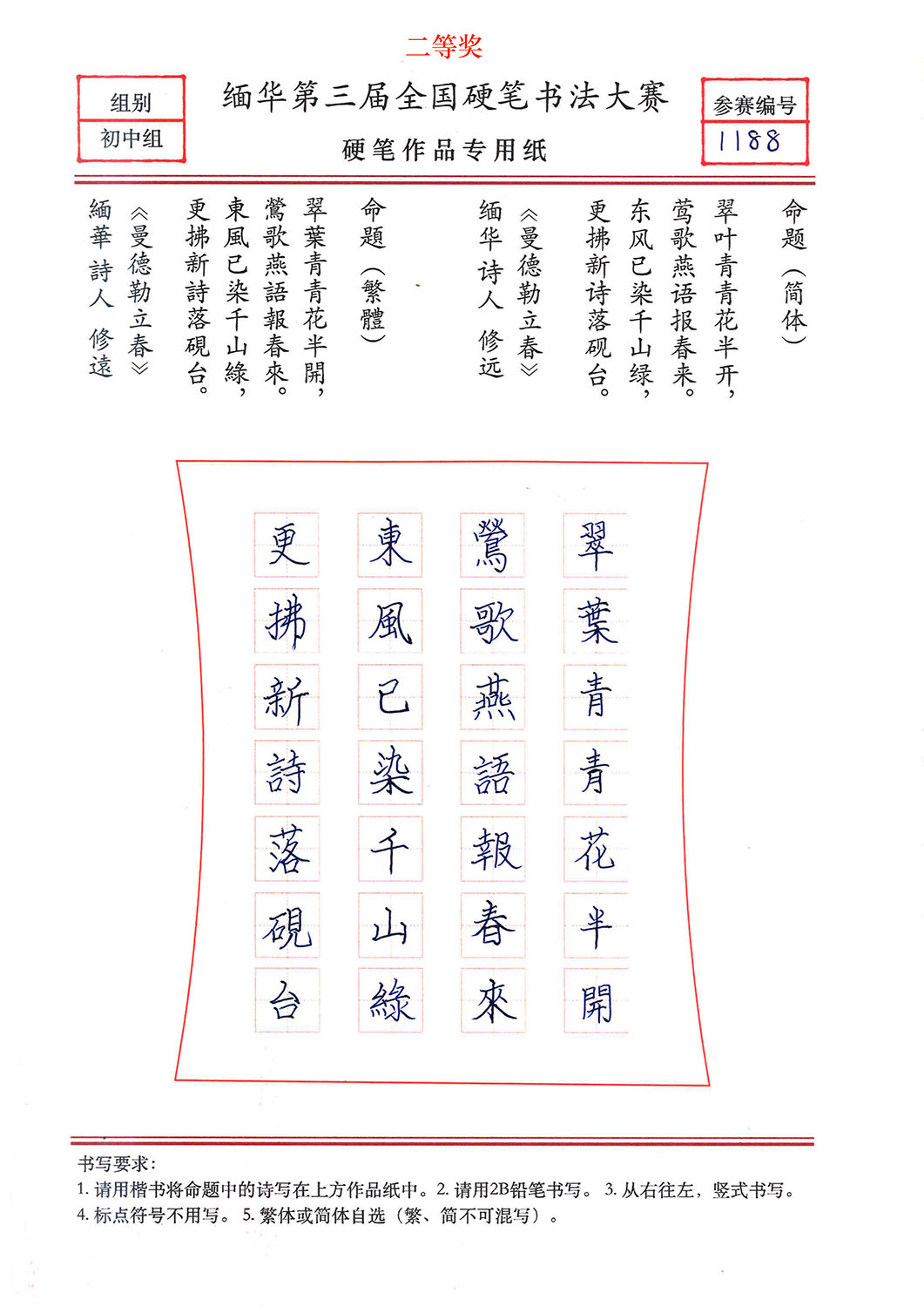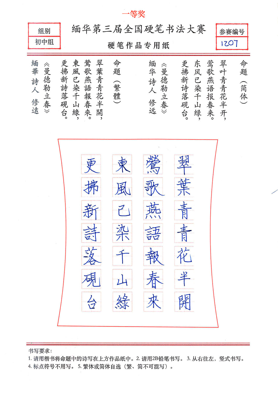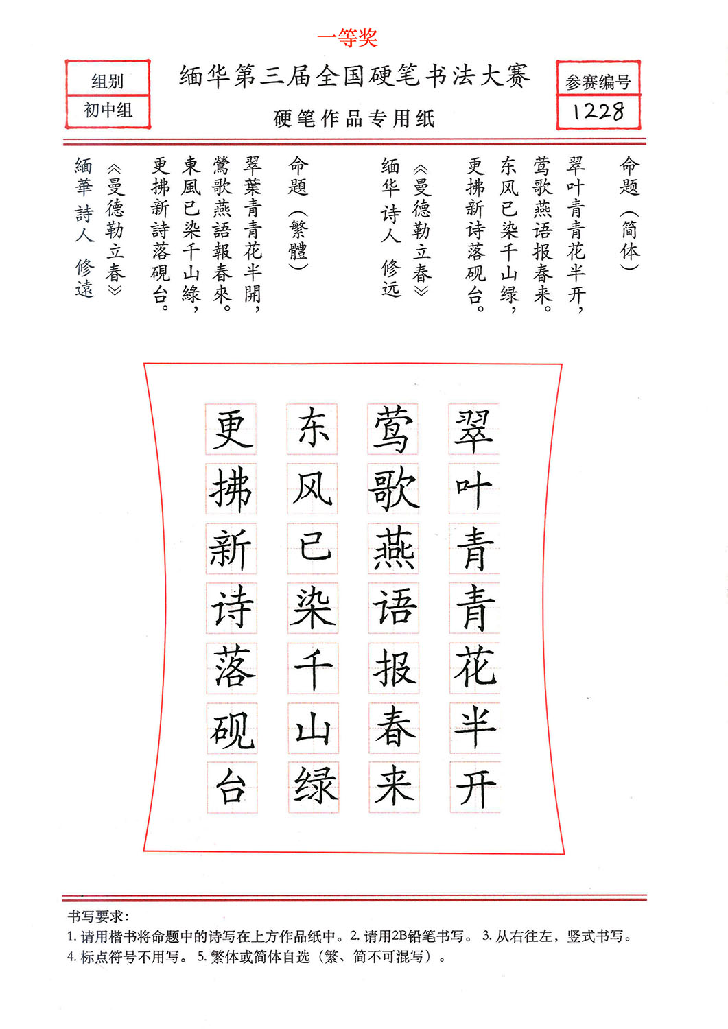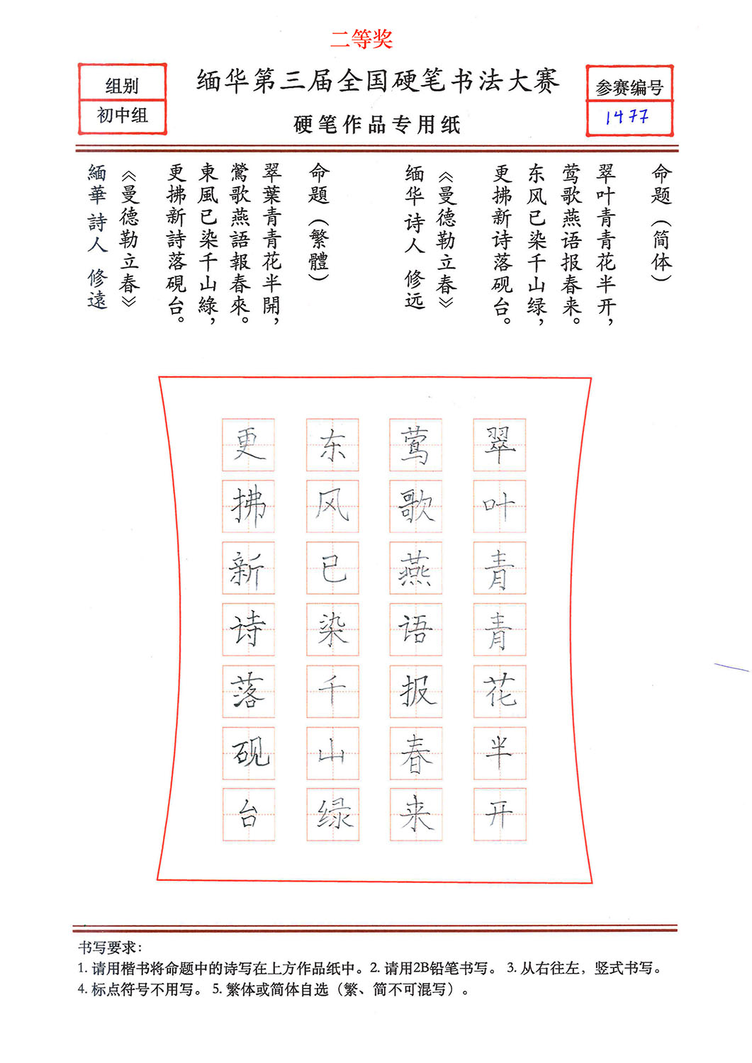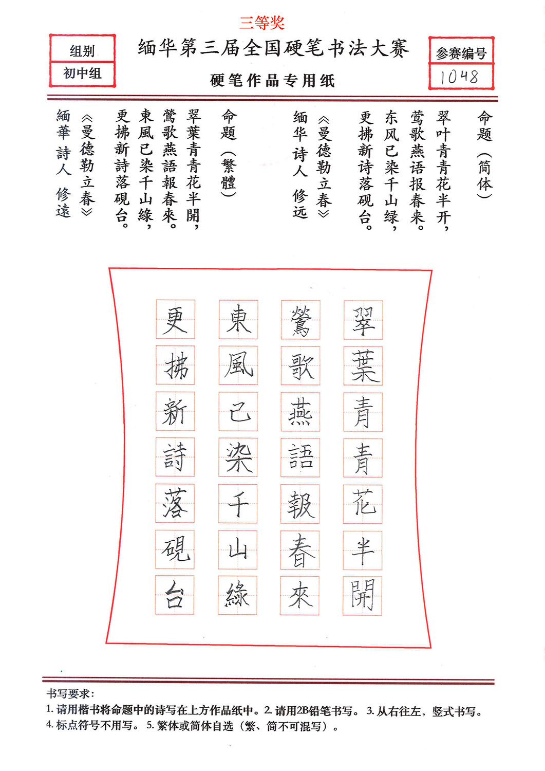 缅华第三届全国硬笔书法大赛获奖作品选登——初中组