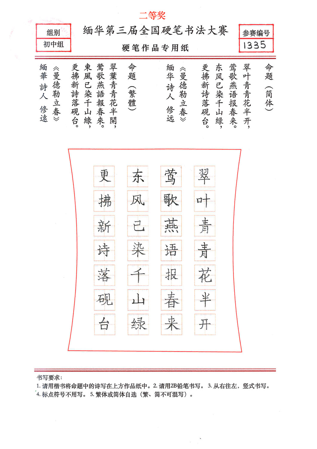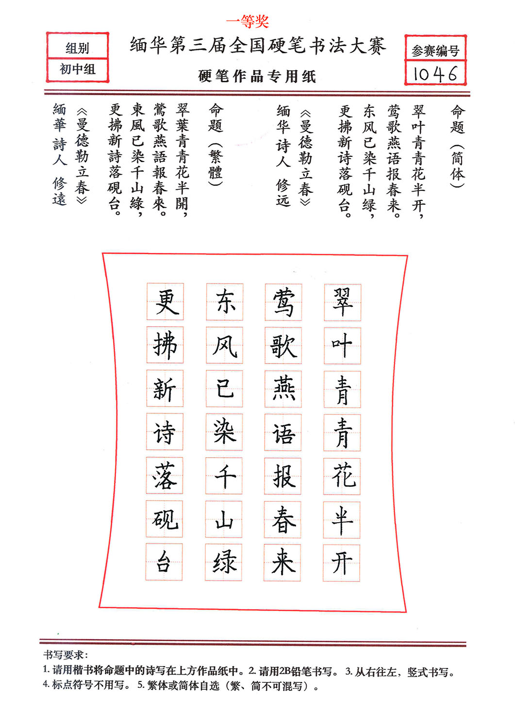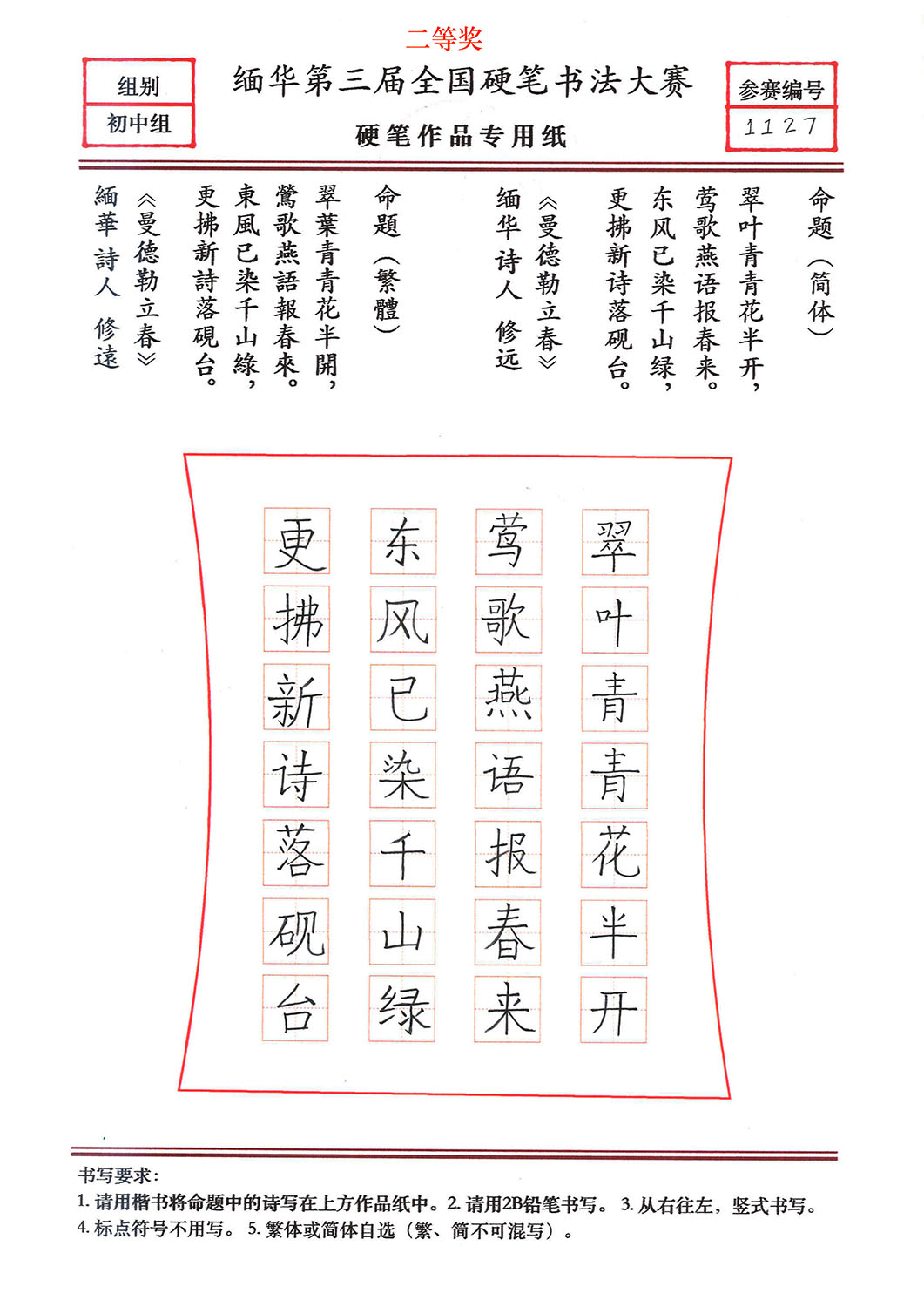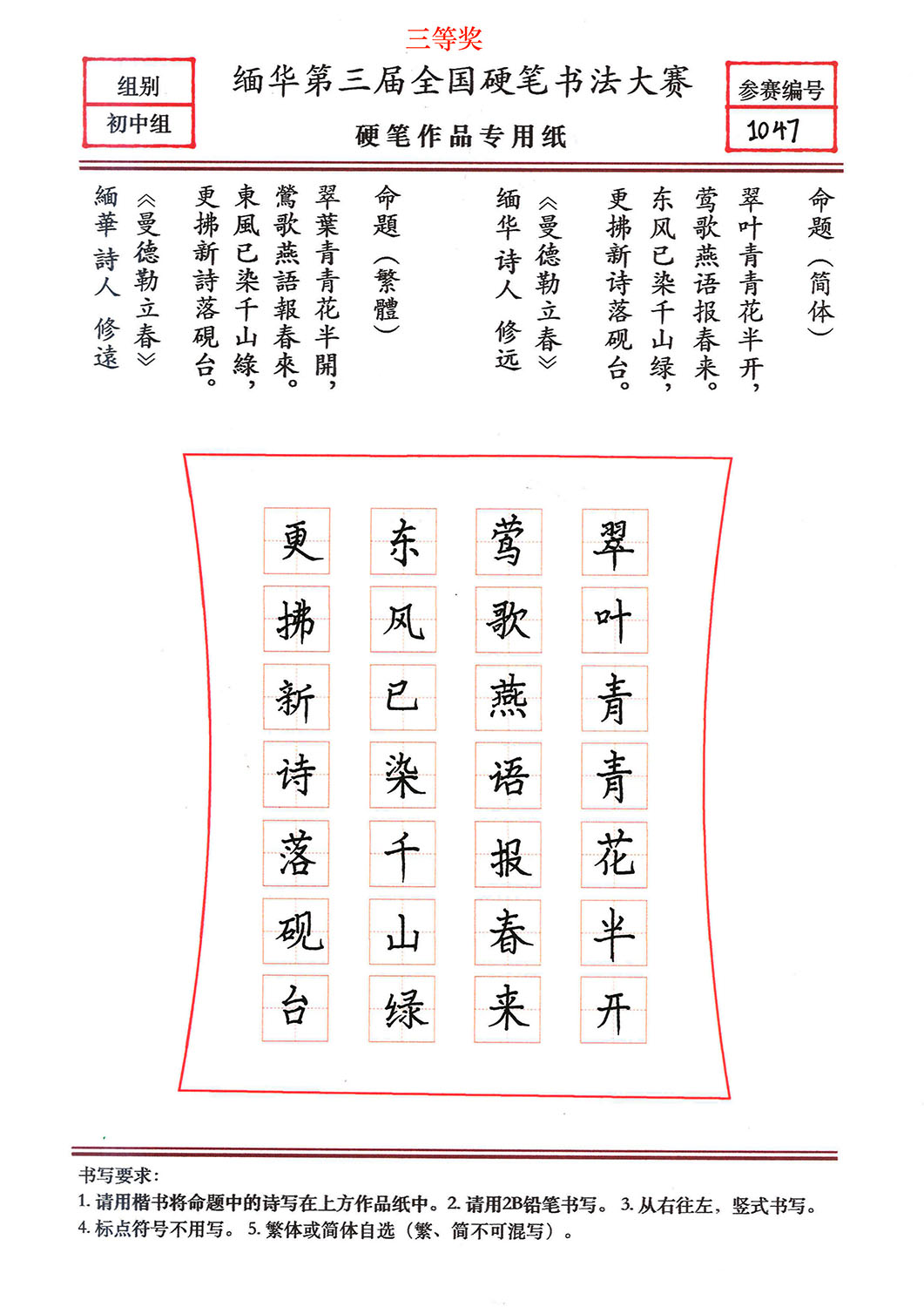 缅华第三届全国硬笔书法大赛获奖作品选登——初中组