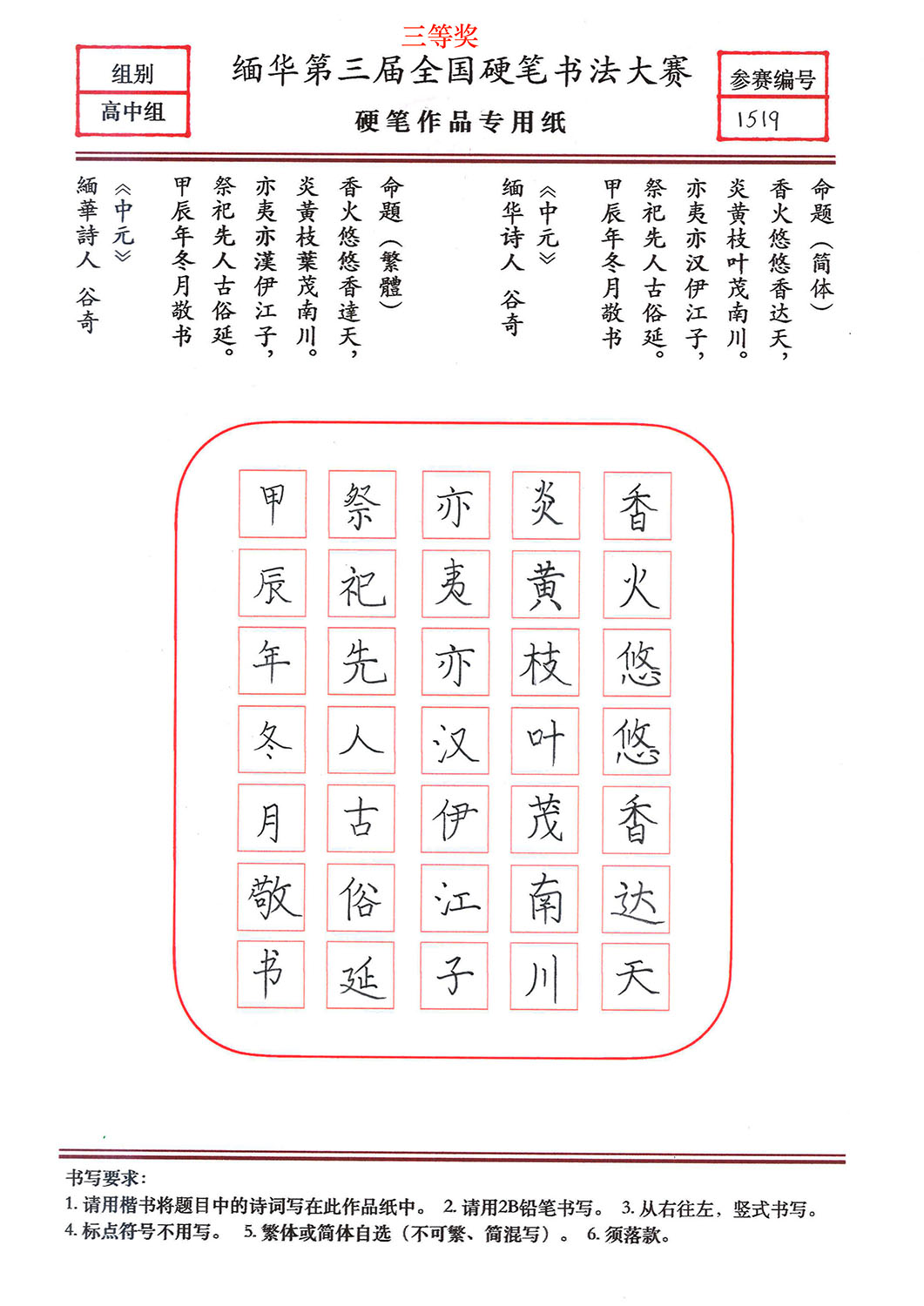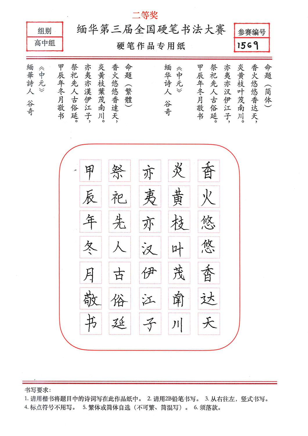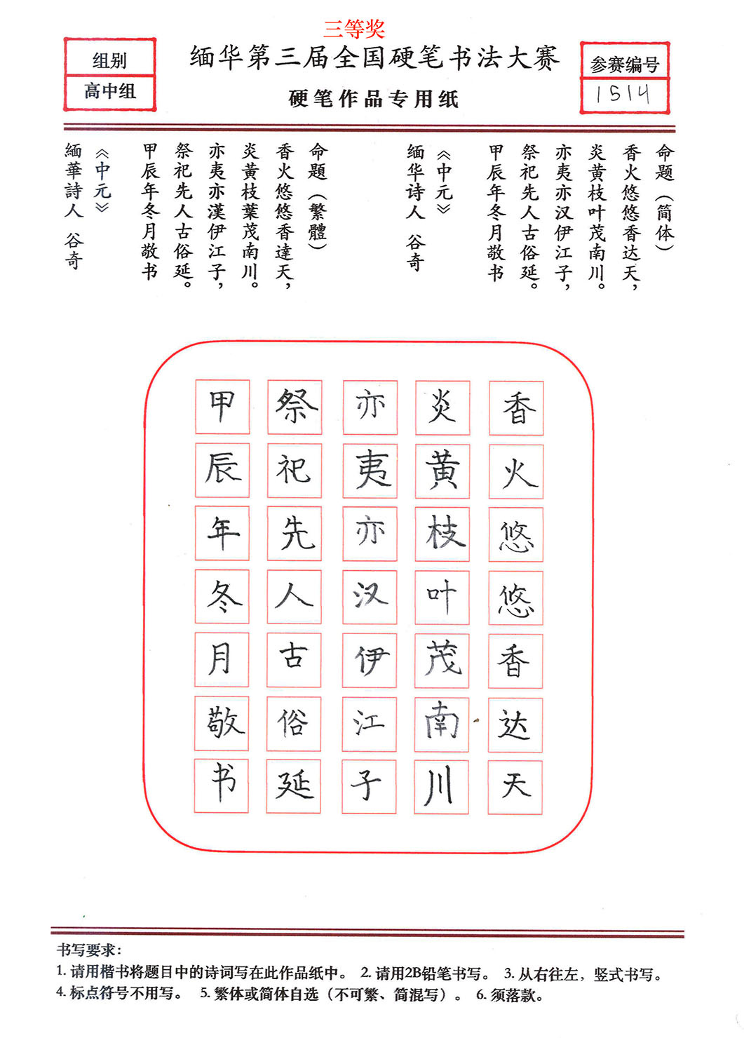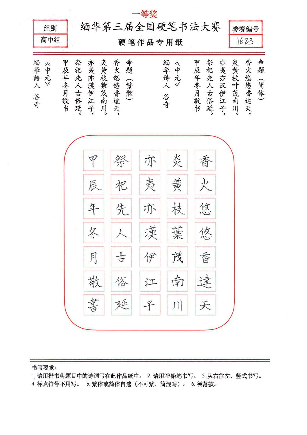 缅华第三届全国硬笔书法大赛获奖作品选登——高中组