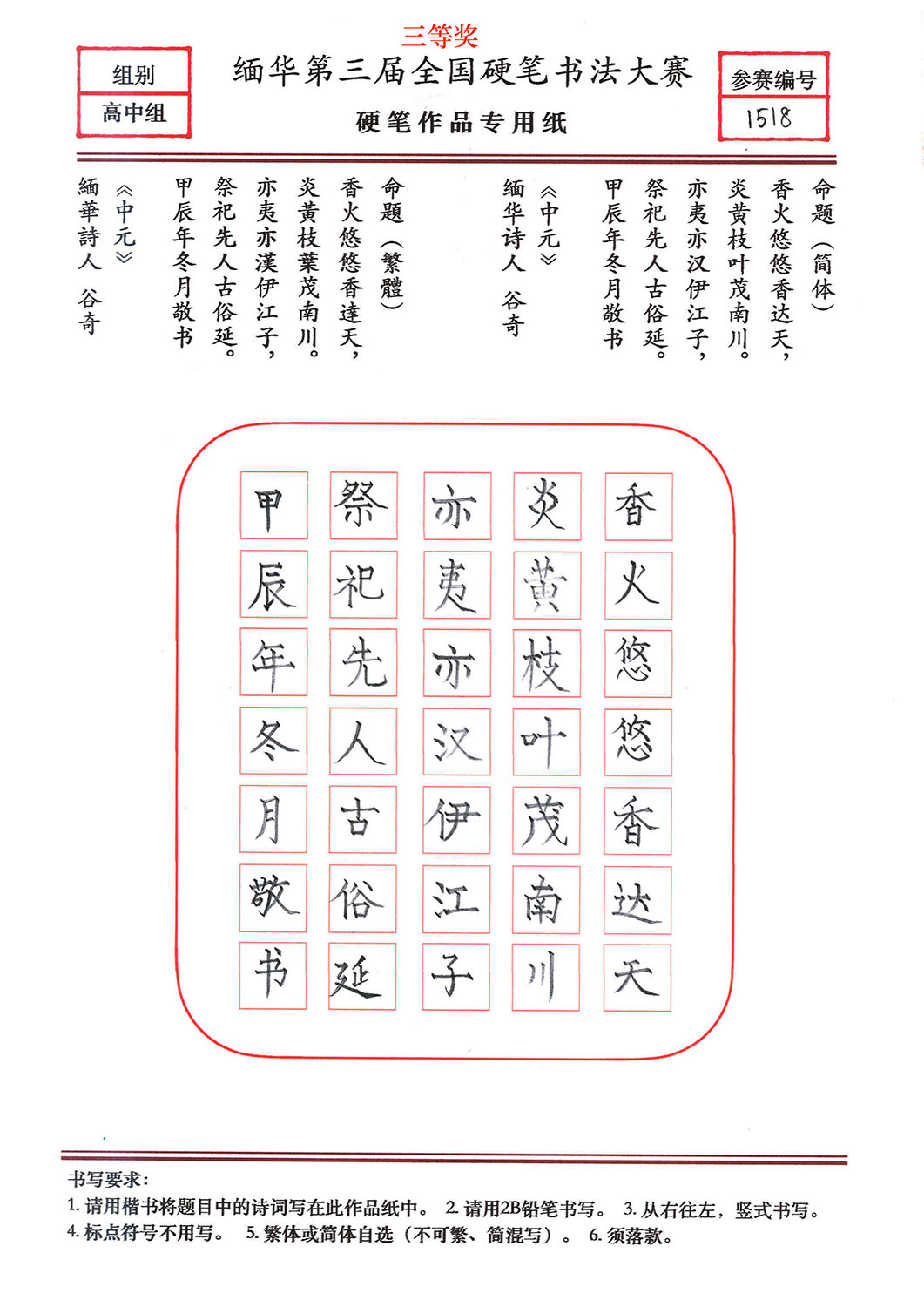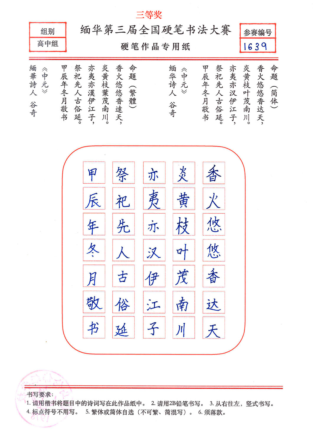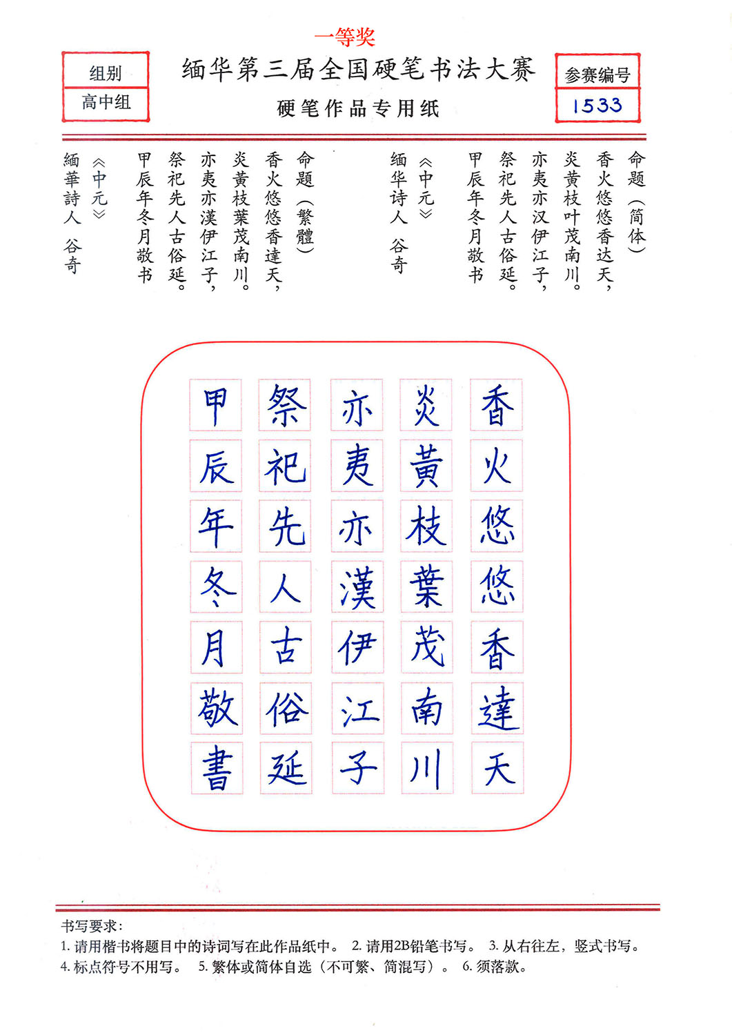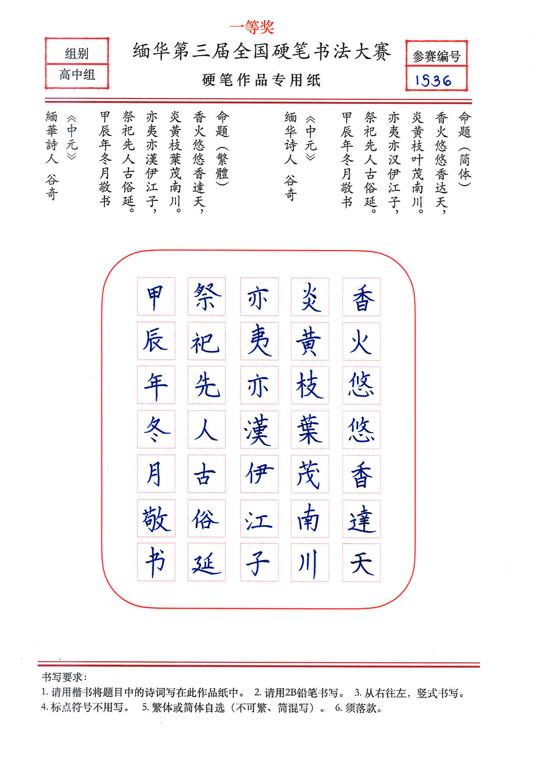缅华第三届全国硬笔书法大赛获奖作品选登——高中组