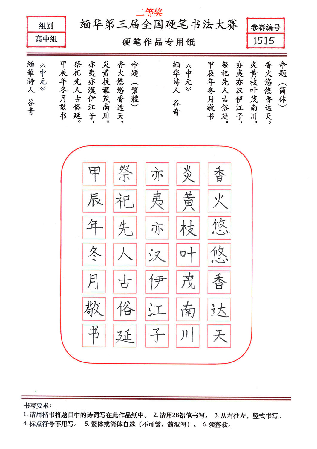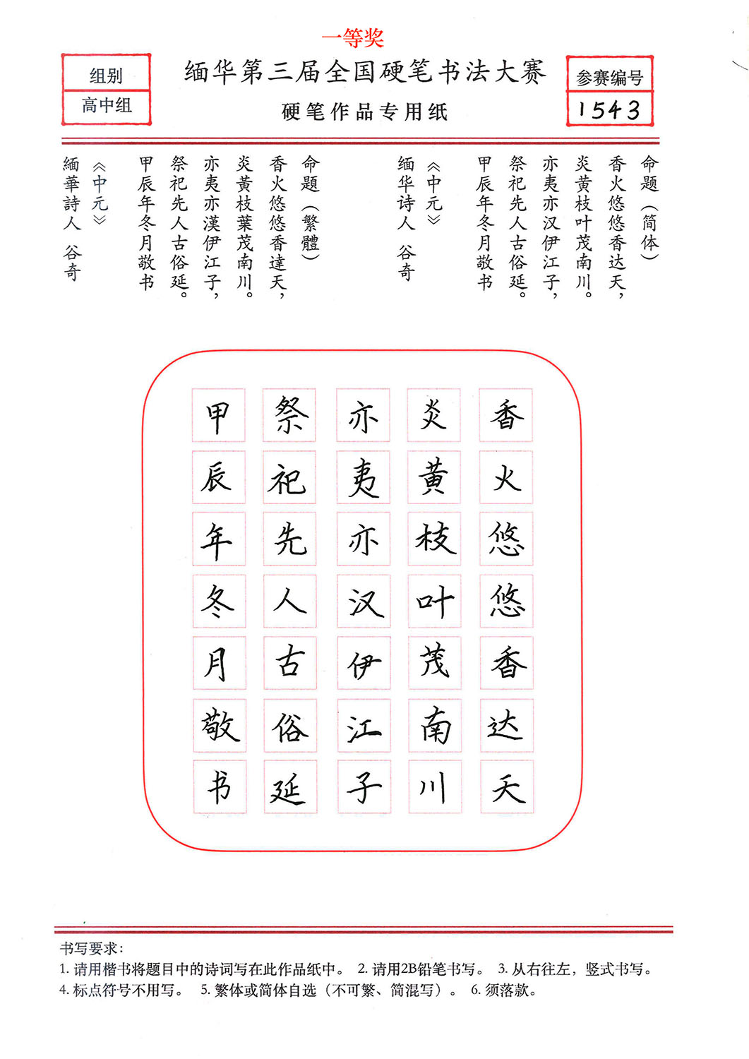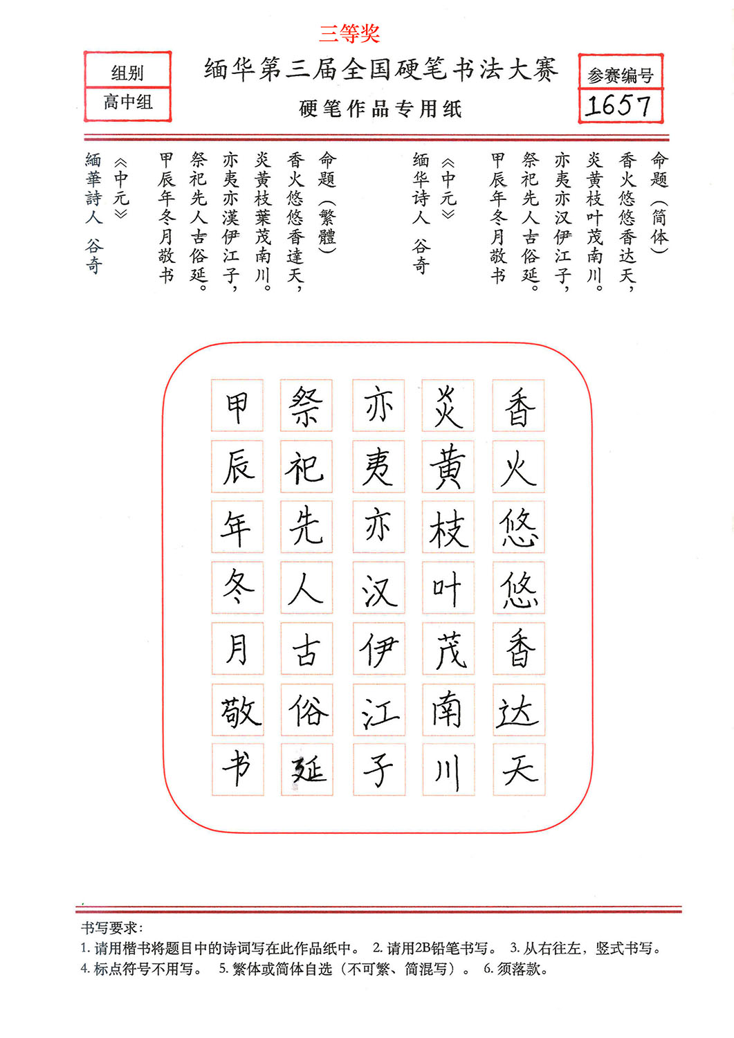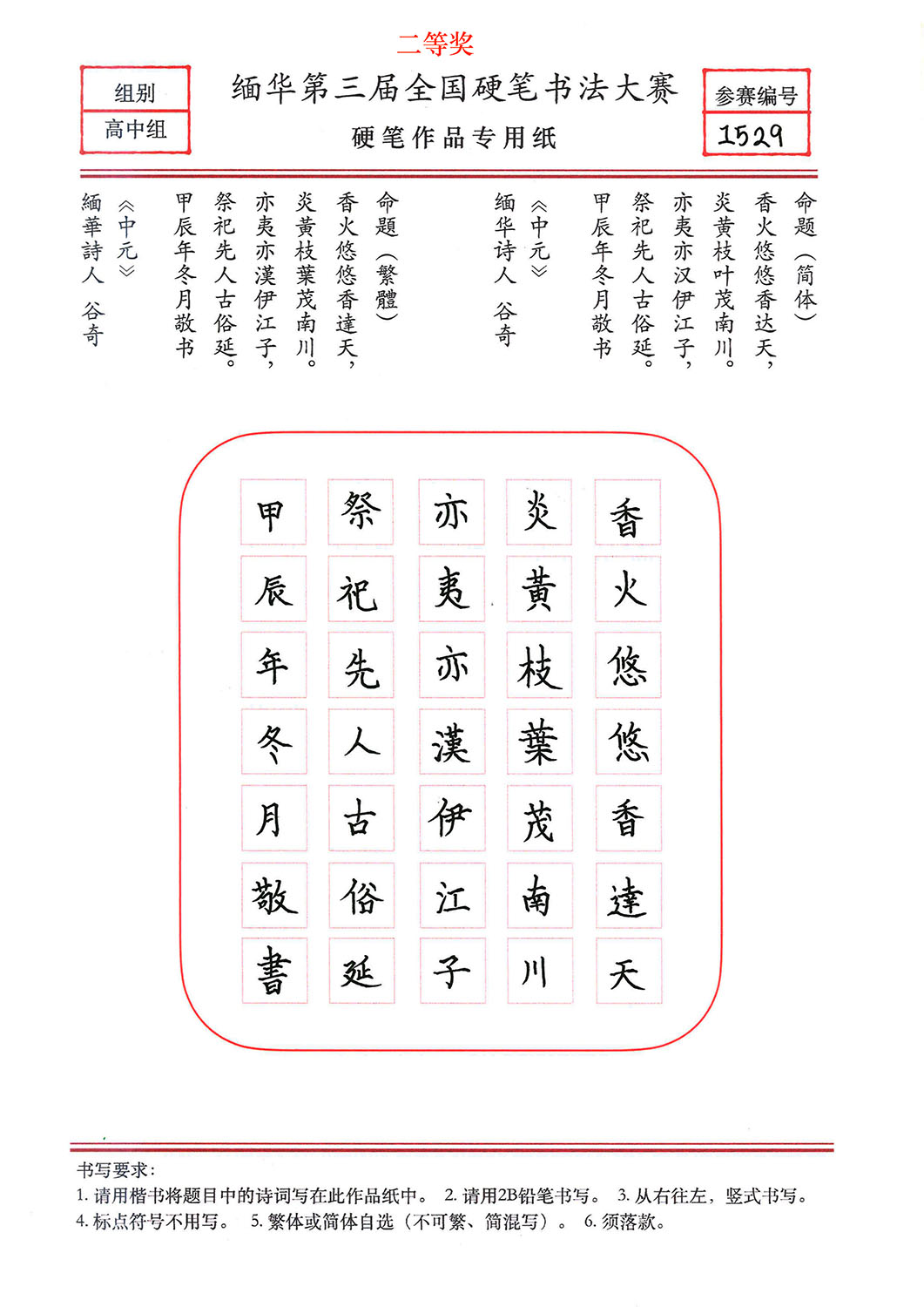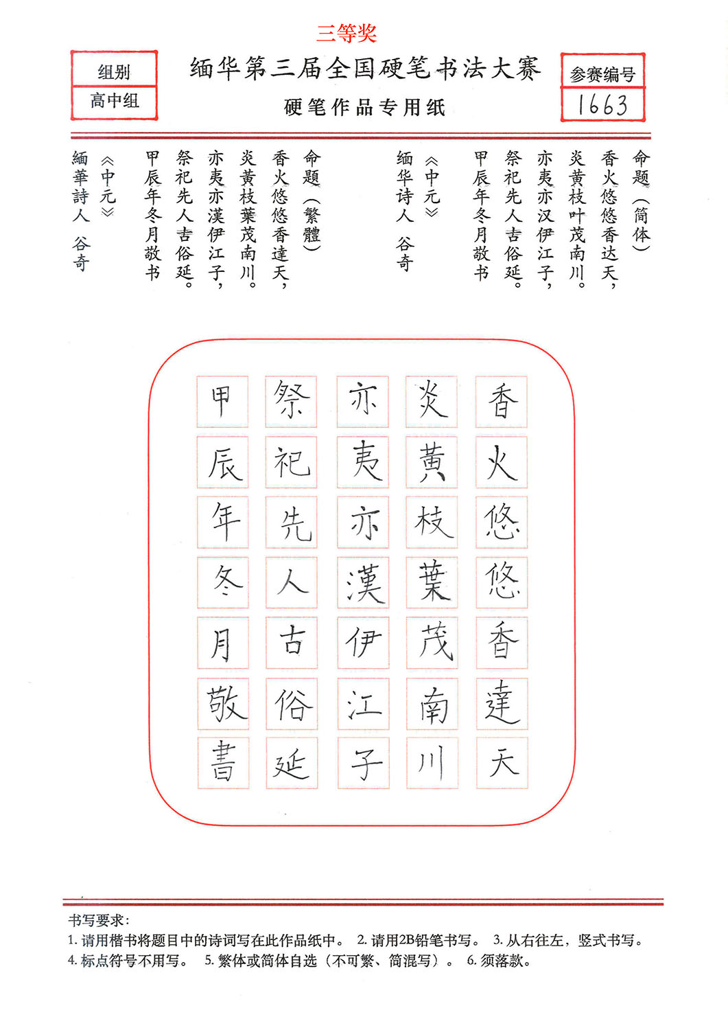 缅华第三届全国硬笔书法大赛获奖作品选登——高中组