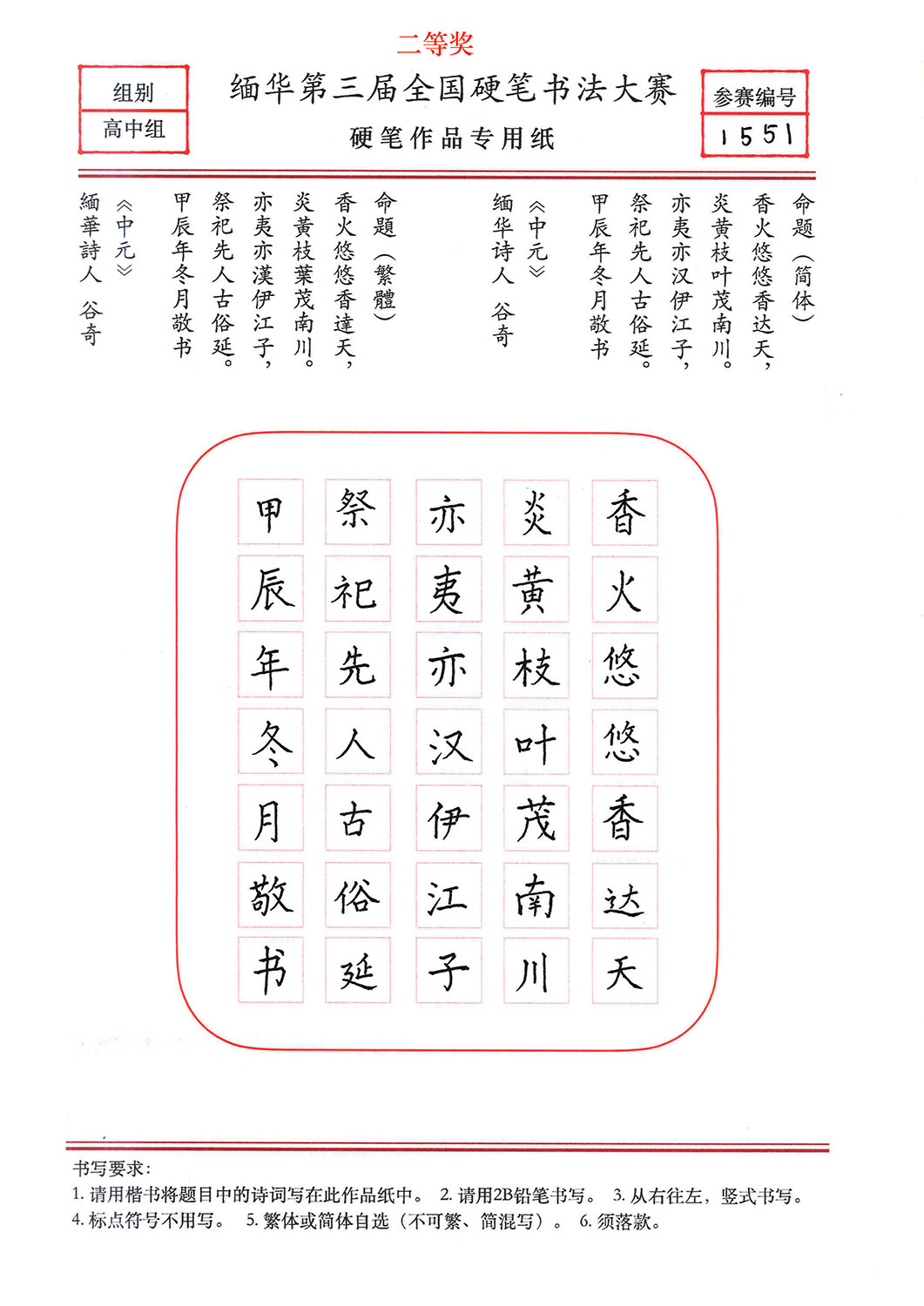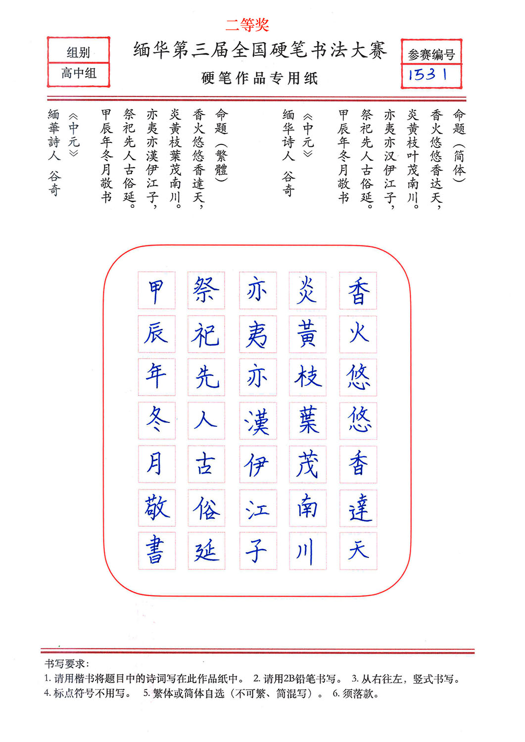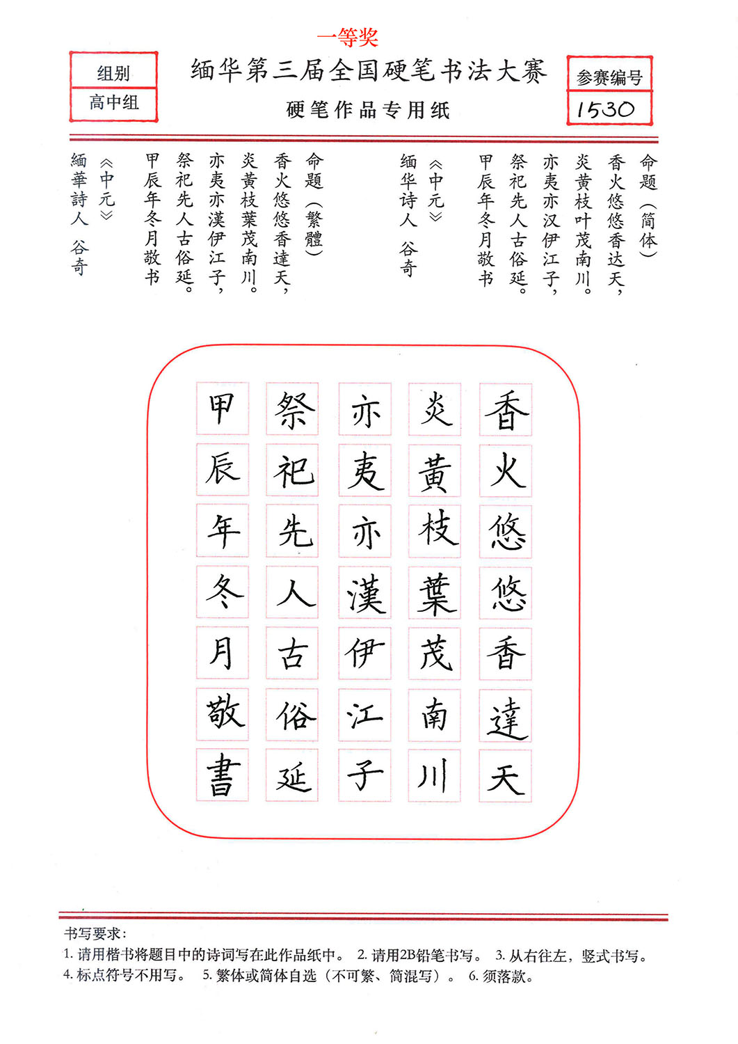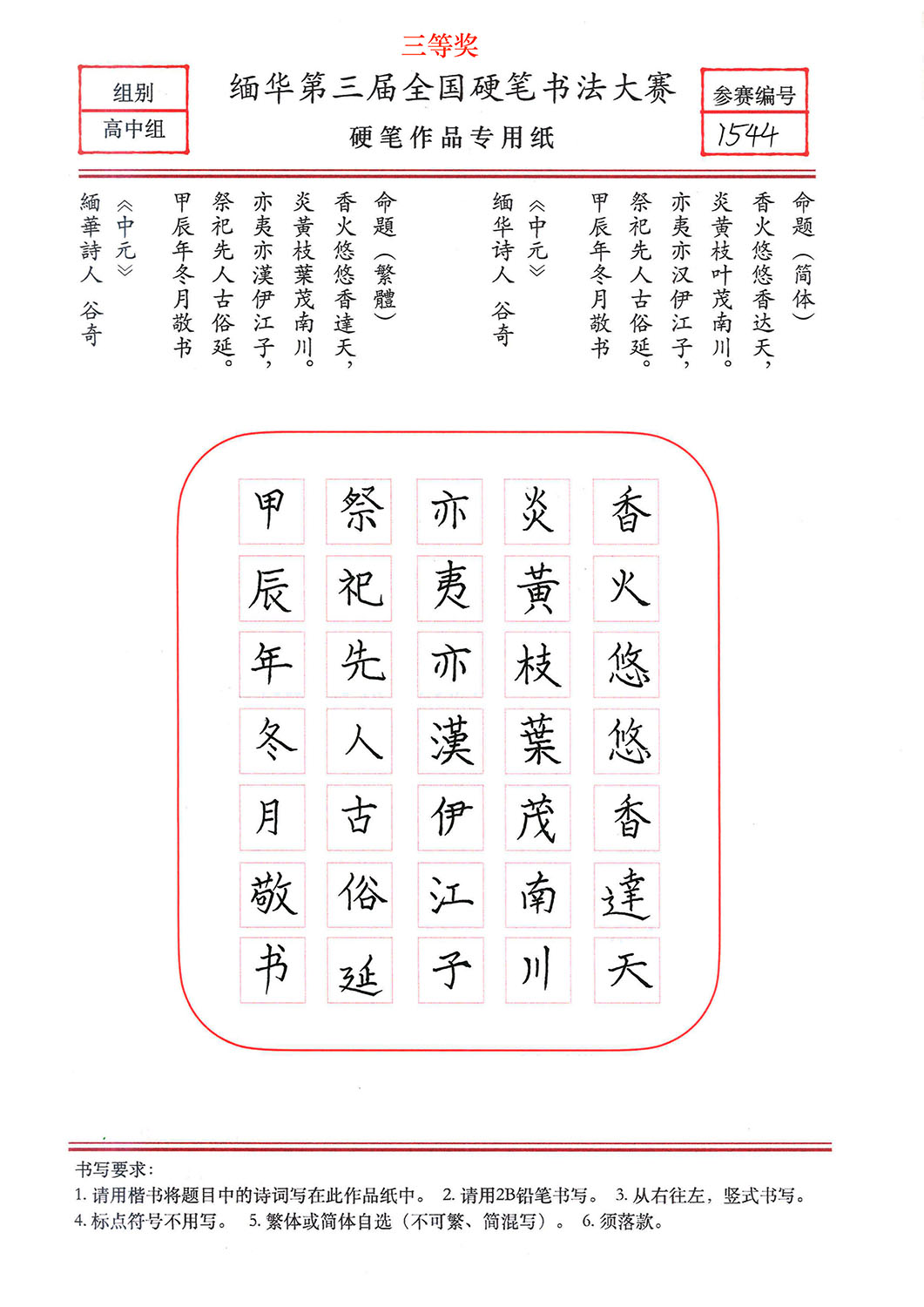 缅华第三届全国硬笔书法大赛获奖作品选登——高中组