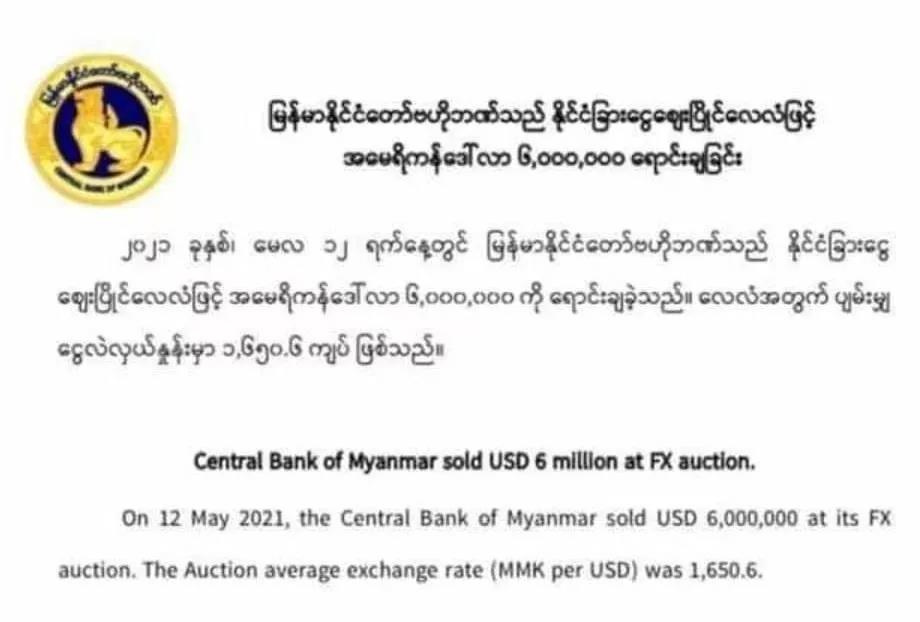 5月12日,缅甸央行宣布将投放六百万美元平衡市场汇率。当日缅甸央行规定的缅币汇率为1650缅币兑换1美元,但是目前实际市场汇率已经超过1700缅币兑换1美元。