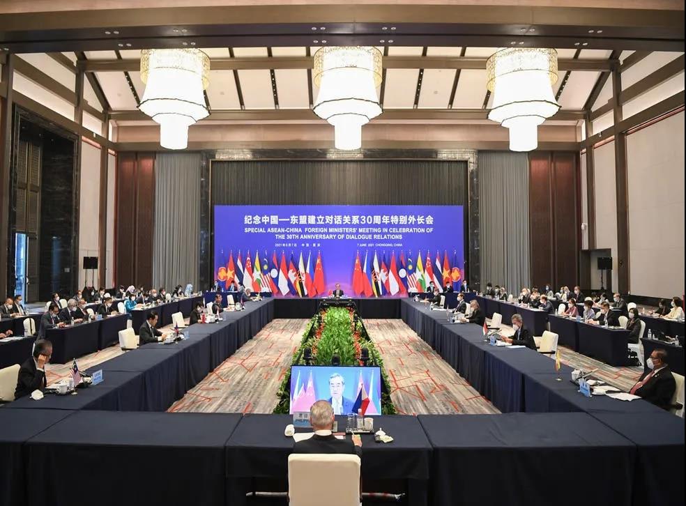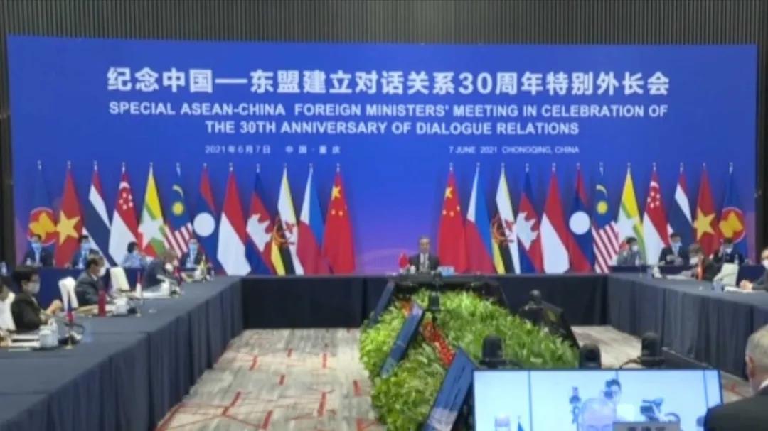 【缅甸金凤凰报讯】6月7日,纪念中国-东盟建立对话关系30周年特别外长会在中国重庆举行。中国国务委员兼外长王毅和中国-东盟关系协调国菲律宾外长洛钦共同主持,新加坡外长维文、印度尼西亚外长蕾特诺、文莱外交主管部长艾瑞万以及东盟秘书长林玉辉等出席会议。