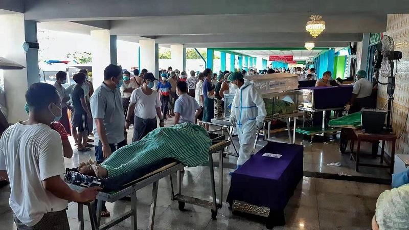 据悉,单就伊洛瓦底省勃生市7月1日至15日,就有210人因确诊新冠肺炎死亡。与此同时,多地疫情仍呈大规模爆发趋势,据相关部门的数据显示,7月14日,缅甸新增确诊7083例,其中有1/4来自勃固省。在有775户家庭近4千人居住若开邦妙乌镇欣伯盖安置营,也发现确诊病例,目前该安置营已封闭。7月15日,泰缅边境克伦邦妙瓦底有22名患者死亡。6月16日至7月16日,果敢自治区老街确诊1945人,死亡5人,当地使用200个集装箱新建了一座可容纳约1200人的隔离中心。7月16日,木姐市新增确诊57例,当局开始扩建能容纳600余人的隔离中心,同日,腊戌市确诊6人,截至当日,第三波疫情已致腊戌确诊1011人,死亡40多人。