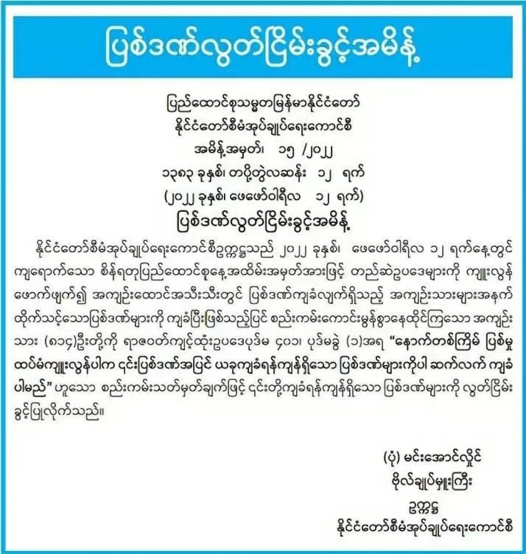 通令中还表示,被判监禁80年有期徒刑的克伦邦前首席部长楠钦推敏(Nan Khin Htwe Myint)的刑期也将减半,改为监禁40年。