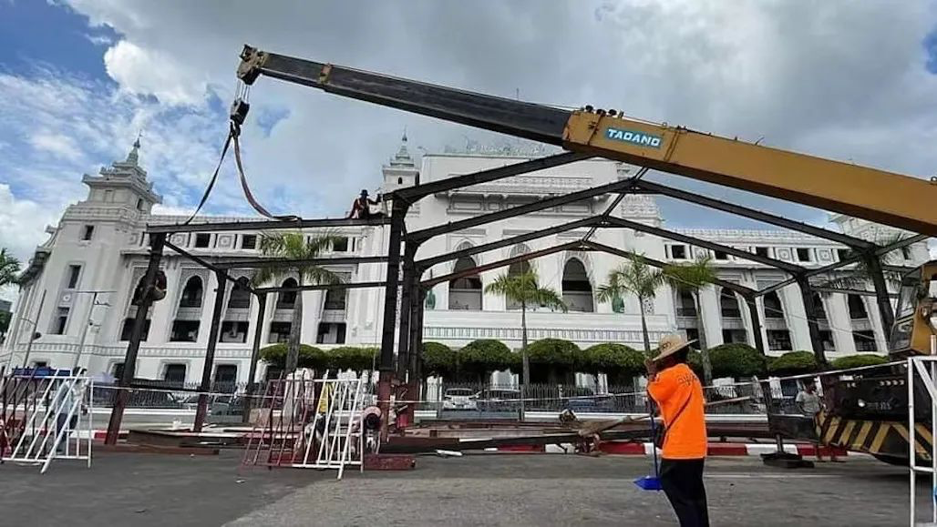 【缅甸金凤凰讯】国防军计划在仰光和曼德勒等大城市举办泼水节,目前已在市政厅前搭建泼水台,为迎接缅甸新年做准备。