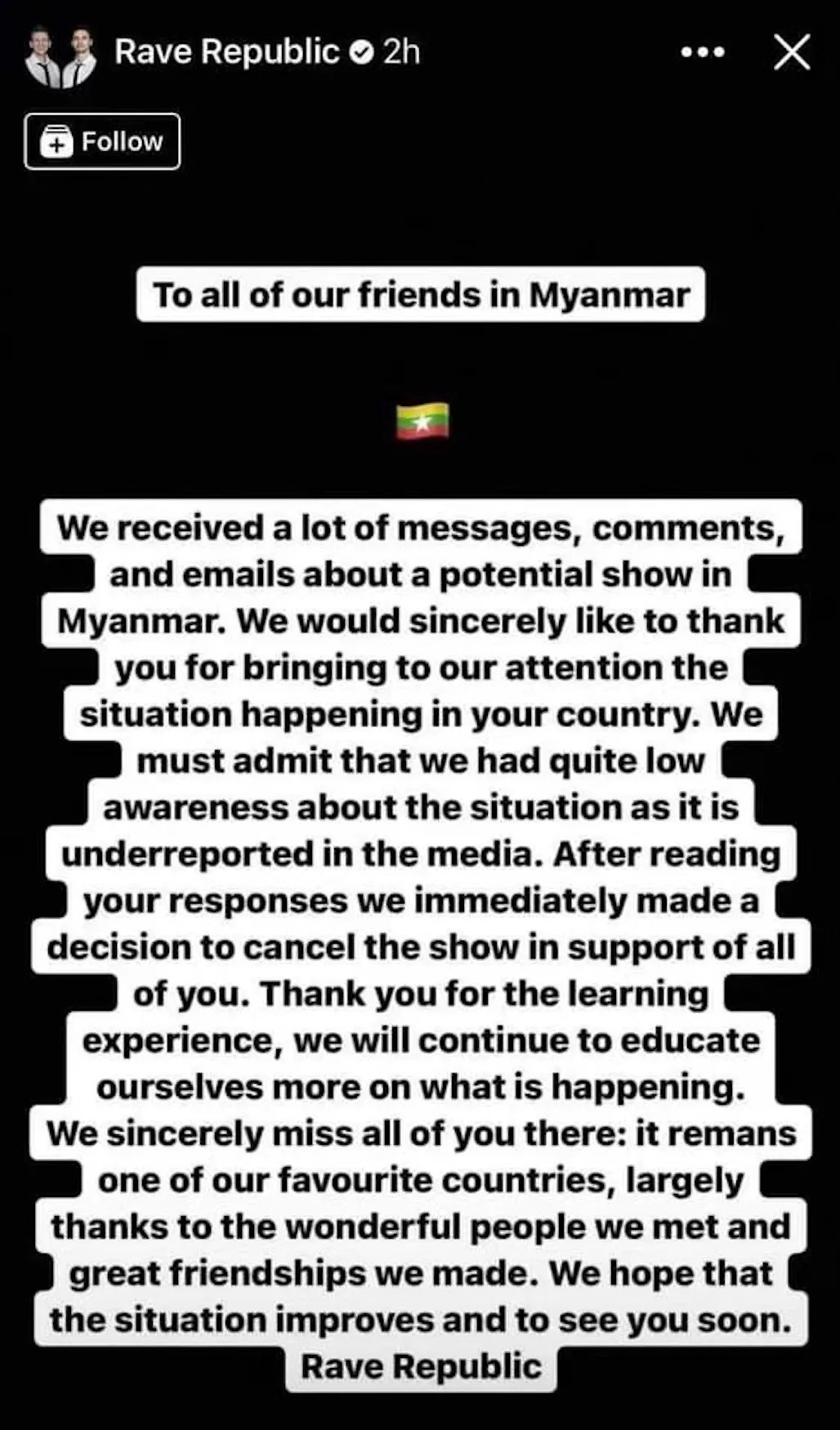 另外,总部位于新加坡的DJ团队Rave Republic于3月20日受邀出席在内比都举行的缅甸泼水节演出,但由于缅甸人民的强烈抗议,他们取消了他们的演出。3月21日,他们在社交媒体页面上宣布,Rave Republic对缅甸目前的情况了解不多,因此接受了演出邀请。但后来收到很多表达不满的简讯、邮件,所以决定取消到缅甸演出的计划。