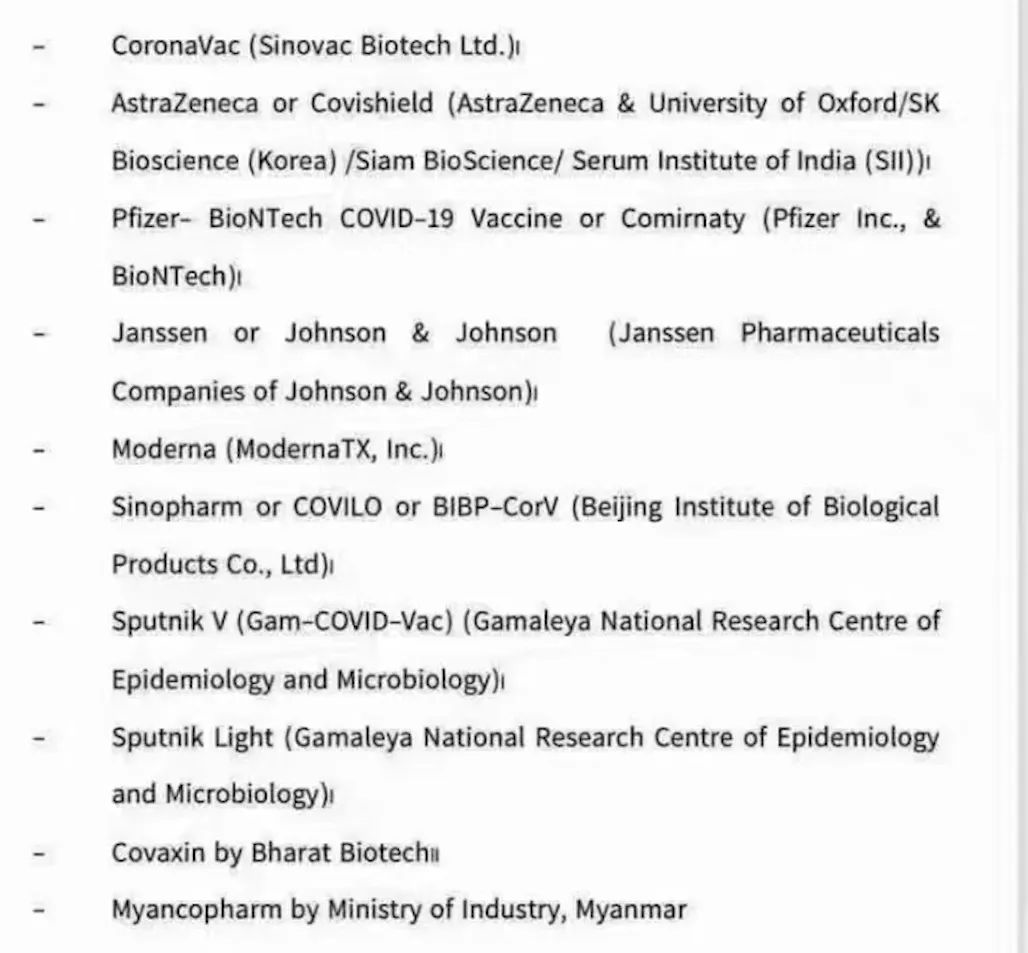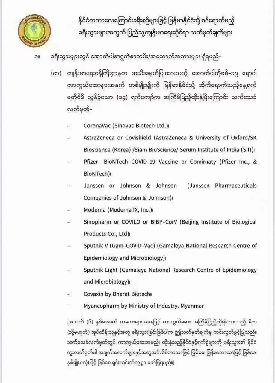 A.在抵达缅甸前14天接种获得卫生部批准的以下新冠肺炎疫苗的完成证明: