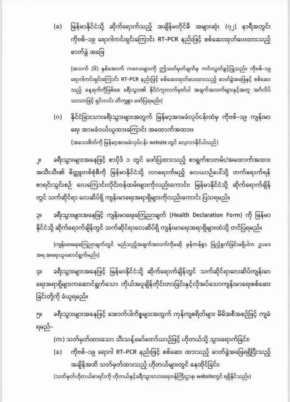 9.在离开缅甸之前,游客可以根据他们将前往或停留的国家的要求,在卫生部认可的实验室自付检测新冠肺炎。