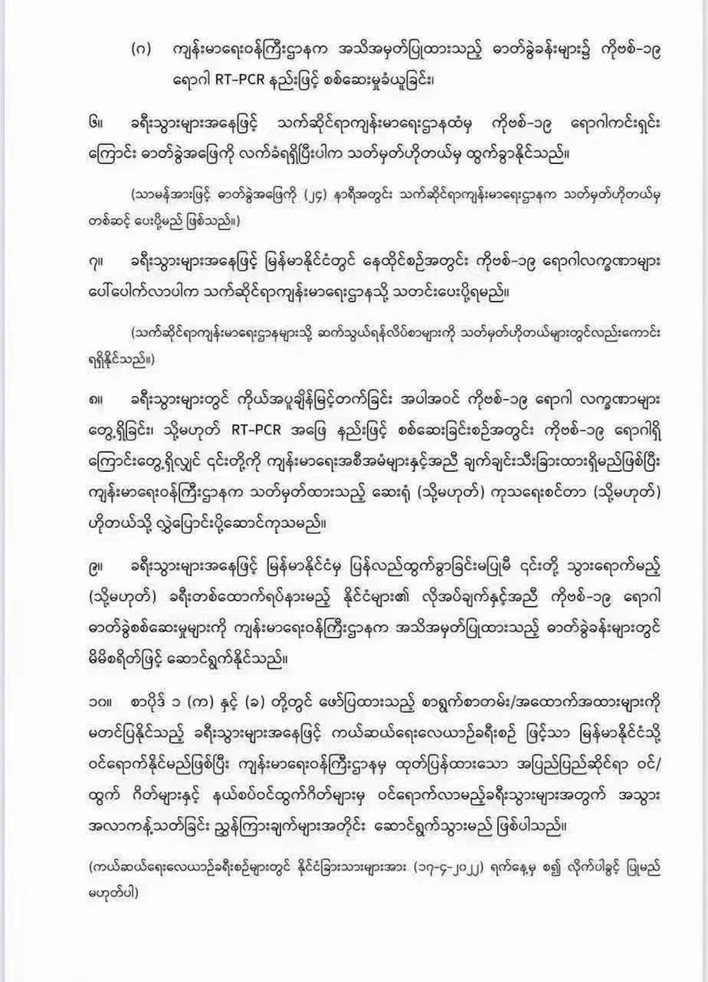 10.无法出示第1条(a)和(b)段中提到的文件的旅客只能乘坐救援航班进入缅甸。另外,卫生部发布的从国际机场入境和边境入境的游客,将遵循交通限制实施。(从2022年4月17日起,将不允许外国人乘坐救援航班。)