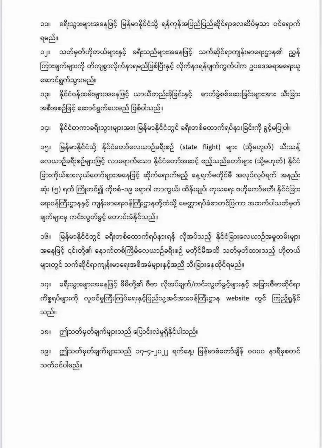 15.乘坐缅甸国家航班或私人航班抵达缅甸的国家级客人或外国代表团必须在抵达日期前至少5个工作日,可向新冠肺炎防控治疗中央委员会、外交部和卫生部申请免除上述规定。