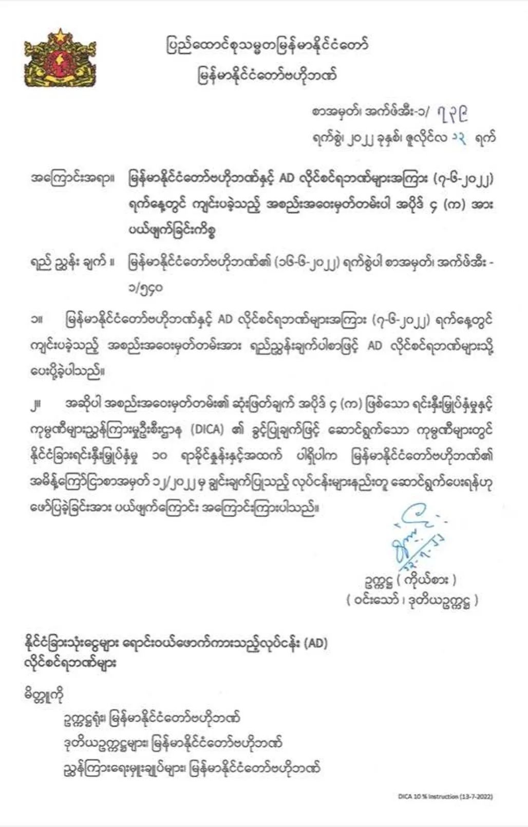 央行通告称,参照缅甸央行与AD持牌银行6月7日会议记录发出的一封信函。会议决议的第4条(a)款规定,经投资与公司管理局批准的持有外资10%及以上的公司,豁免外汇管制(12/2022)。对此,现在将其撤销。
