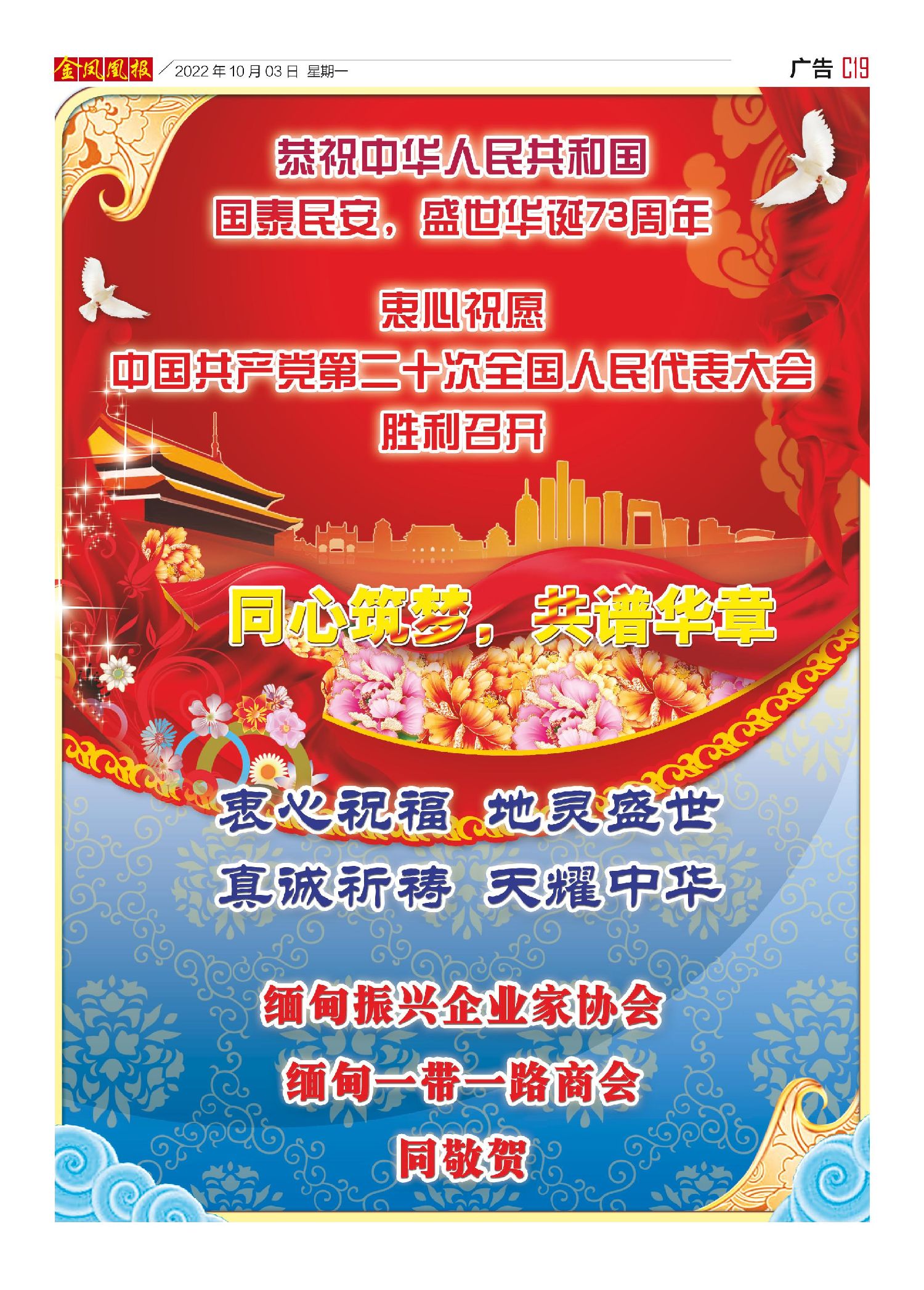 昨天是中华人民共和国73周年华诞,也是缅甸《金凤凰报》15岁的生日。在这特殊的日子里,祝愿我们伟大祖(籍)国繁荣昌盛,国泰民安,祝愿中缅友谊万古长青!《金凤凰报》也将继续与您相伴而行,砥砺奋飞,再书中缅友谊锦绣华章。