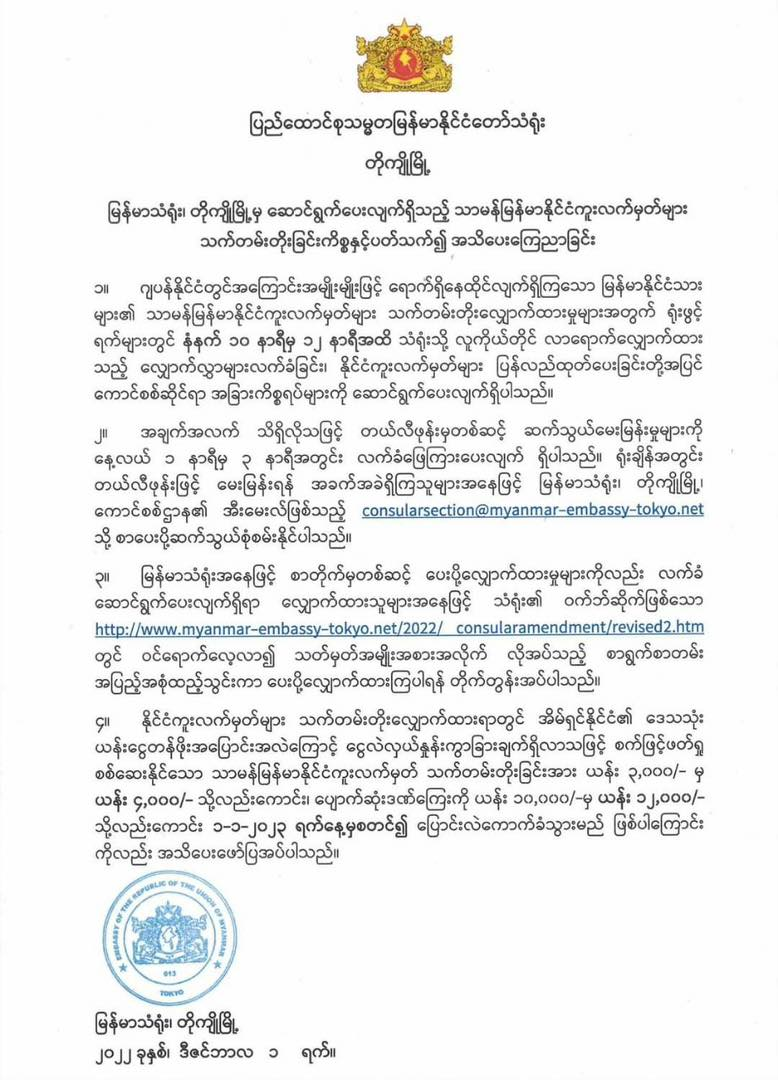 【缅甸金凤凰讯】12月1日,位于东京的缅甸驻日本大使馆通知,从2023年1月1日期,将调整缅甸公民的普通护照延期的费用。