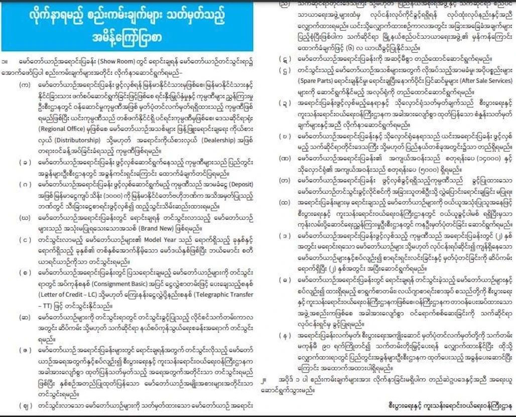 此外,开设汽车展销厅,须出示无欠税证明。作为开设汽车展销厅的担保金,须在中央银行认可的银行开设单独账户并存入1亿缅元。进口到汽车展销厅的车辆必须是全新的,车型年份必须到货年份和低于一年到货年份,并且只能进口左舵车。 汽车展销厅和仓库须设于一个省邦内,汽车展销厅面积须有14000平方英尺,仓库面积须有5000平方英尺。获批开设汽车展销厅的公司不许把进口许可证转售给他人。
