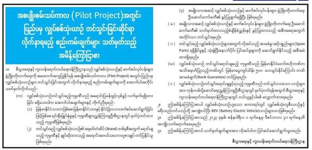 根据在试点计划期间电动汽车进口者须遵守的规定,在试点计划期间进口电动汽车(EV)的公司须是在投资与公司局(DICA)注册的公司,须出示在中央银行认可的银行存入5000万缅元的银行证明。在国家电动汽车及相关产业发展指导委员会的批准下,电动汽车进口公司只能进口规定的电动汽车数量。此外,进口的车辆须在陆路运输局办理注册。对进口电动汽车所需的保证、备件、使用后维修等事情进行准备。