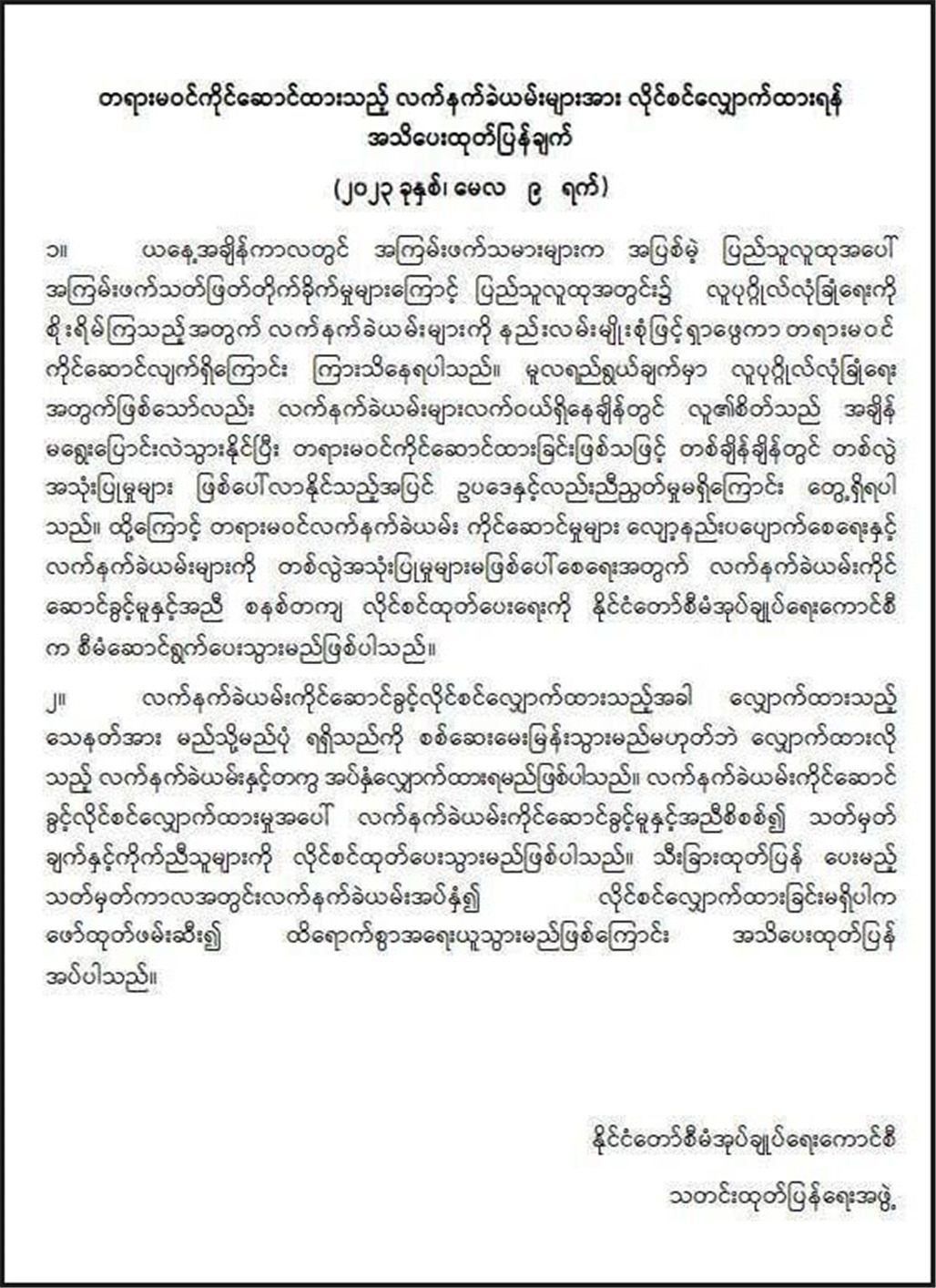 【缅甸金凤凰讯】据悉,国管委5月9日晚宣布,此前由于恐怖袭击事件,国管委按要求批准为个人安全可佩戴枪弹的通告,对于个人所佩戴的枪支,国管委现要求申请枪支携带许可证。