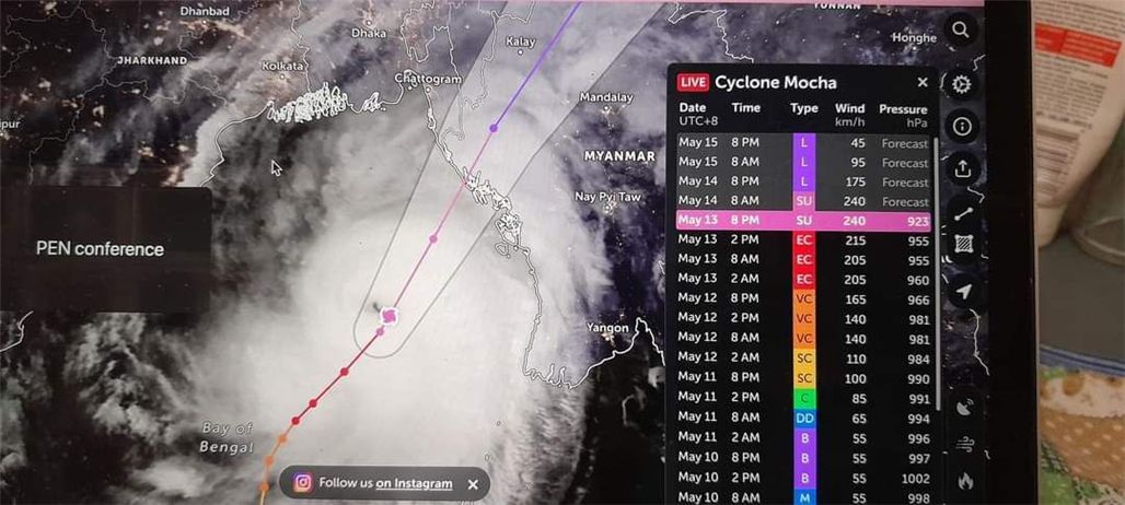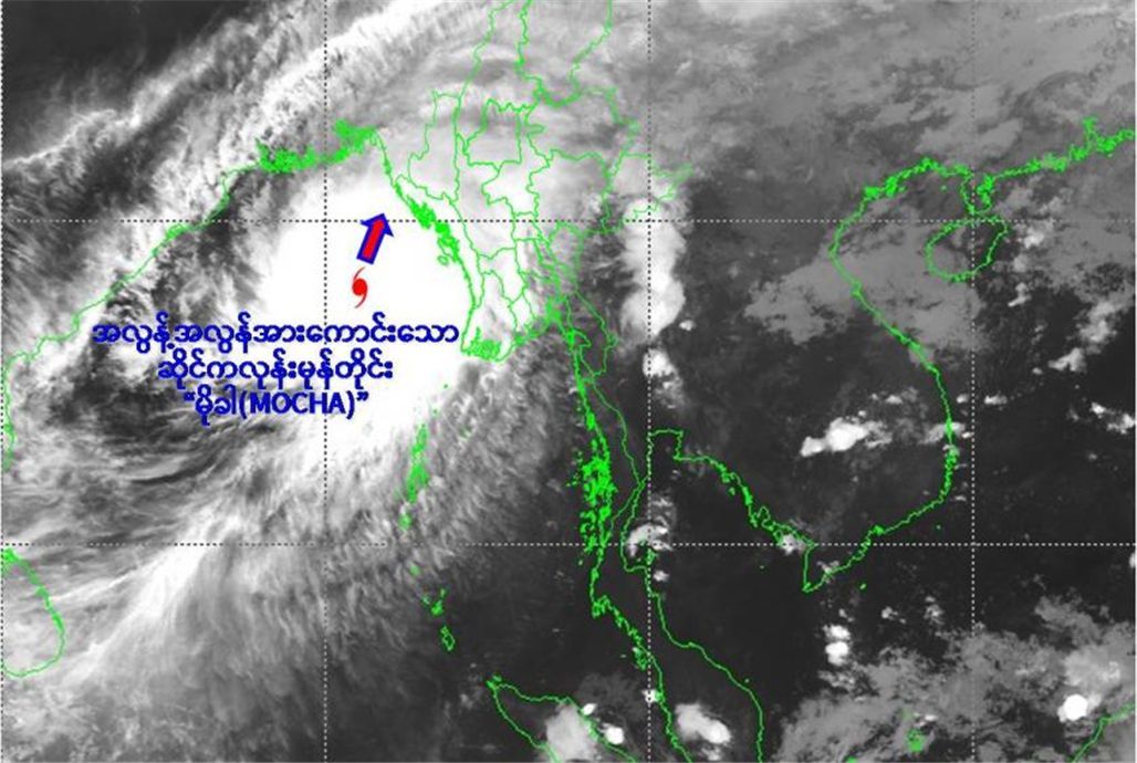 气象与水文局局长表示,目前,风暴MOCHA中心外的云层开始越过实兑附近的若开邦海岸,风暴中心将于今天中午从实兑附近经过,人们应该到安全的地方避险。如果预警是红色级别,就应该往避难所里面转移,越靠近风暴中心,风速就越大,所以这时候一定要在安全的地方躲避风险。接下来,风速将逐渐增加,所以在得到风暴安全的声明之前不要外出。