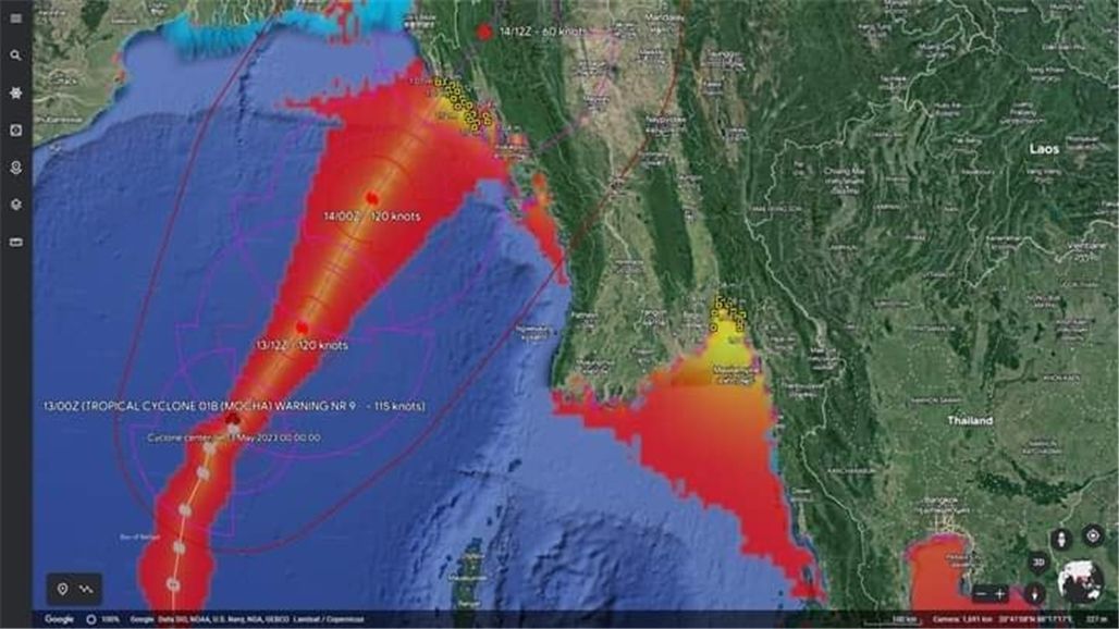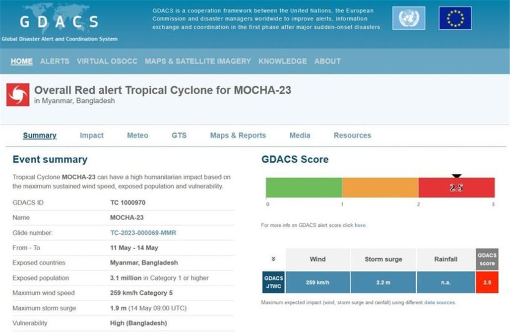 全球灾害警报和协调系统(GDACS)在其网站上发布消息称,今天(5月14日)上午,超强气旋MOCHA已被列为五级飓风。根据GDACS显示,飓风的最大持续风速为每小时259公里(约合每小时161英里)。根据预测会进入缅甸和孟加拉国,孟加拉国有很高的受害风险。