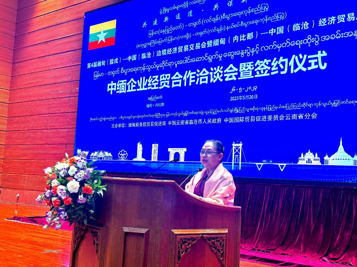 “今天是缅中两国企业经贸合作签署活动,代表着缅甸(内比都)-中国(临沧)经贸展洽会的良好成果,同时,也展示了两国之间的商贸合作的未来前景。”缅甸商务部贸促局局长杜娜木达卡波发言说道,两国企业能够签订双边贸易合作协议是举办本次展洽会的目的之一,通过促进私营领域的合作,有助于进一步加强两国之间的贸易。作为贸促局,我们正在努力通过参加国内和国际贸易展会来获得商机。我还要向抓住这些机会并签署合作协议的各企业负责人表示高兴。最后,预祝本次展会和签约仪式中双方企业取得圆满成功。