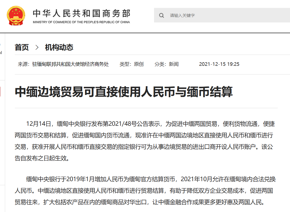 此前,2019年,缅甸央行发布4号令,将人民币正式纳入缅甸官方结算货币;2021年央行第2021/48号公告表示,准许在中缅两国边境地区直接使用人民币和缅币进行交易。缅甸的一系列行动逐步降低缅中双方企业交易成本,促进两国贸易往来,让中缅金融合作成果更多更好惠及两国人民。
