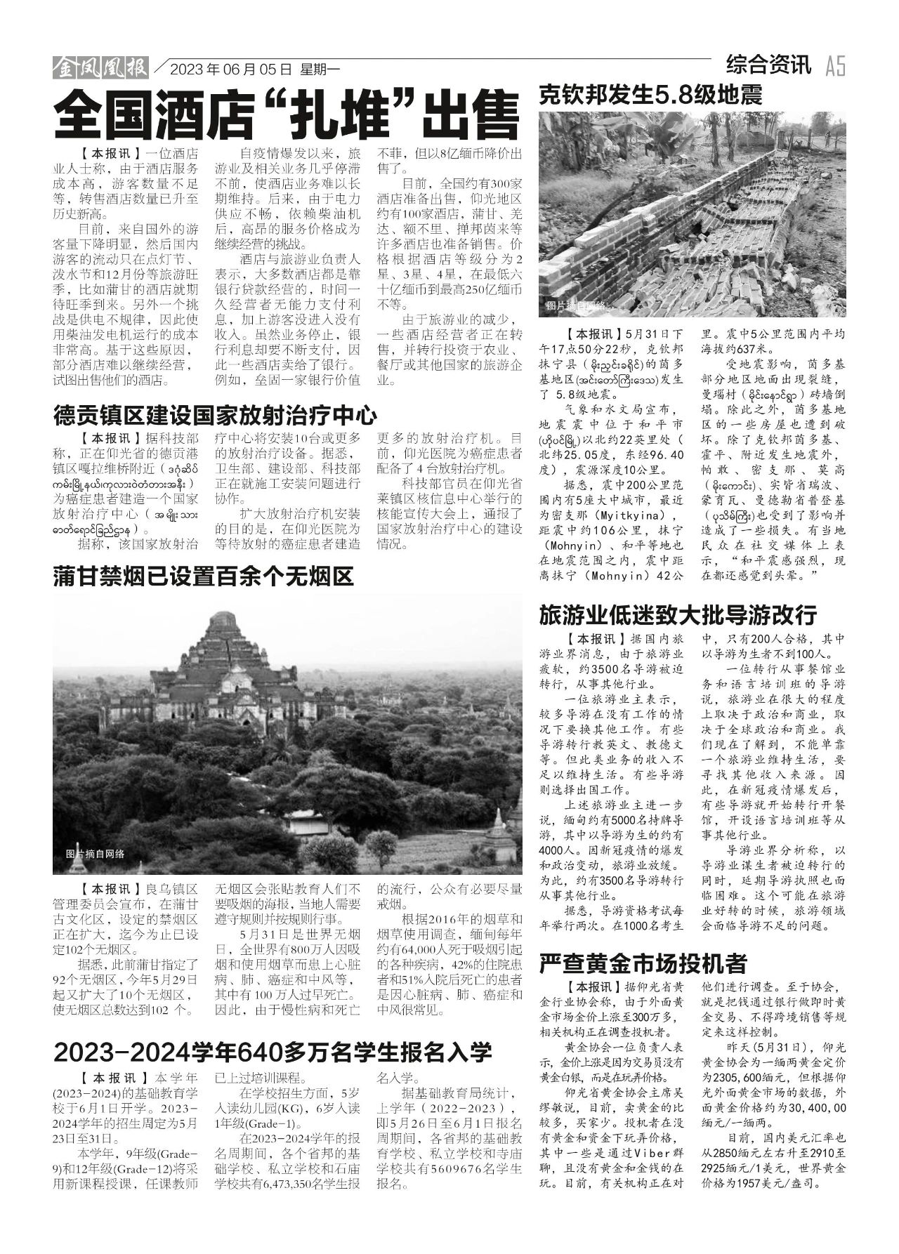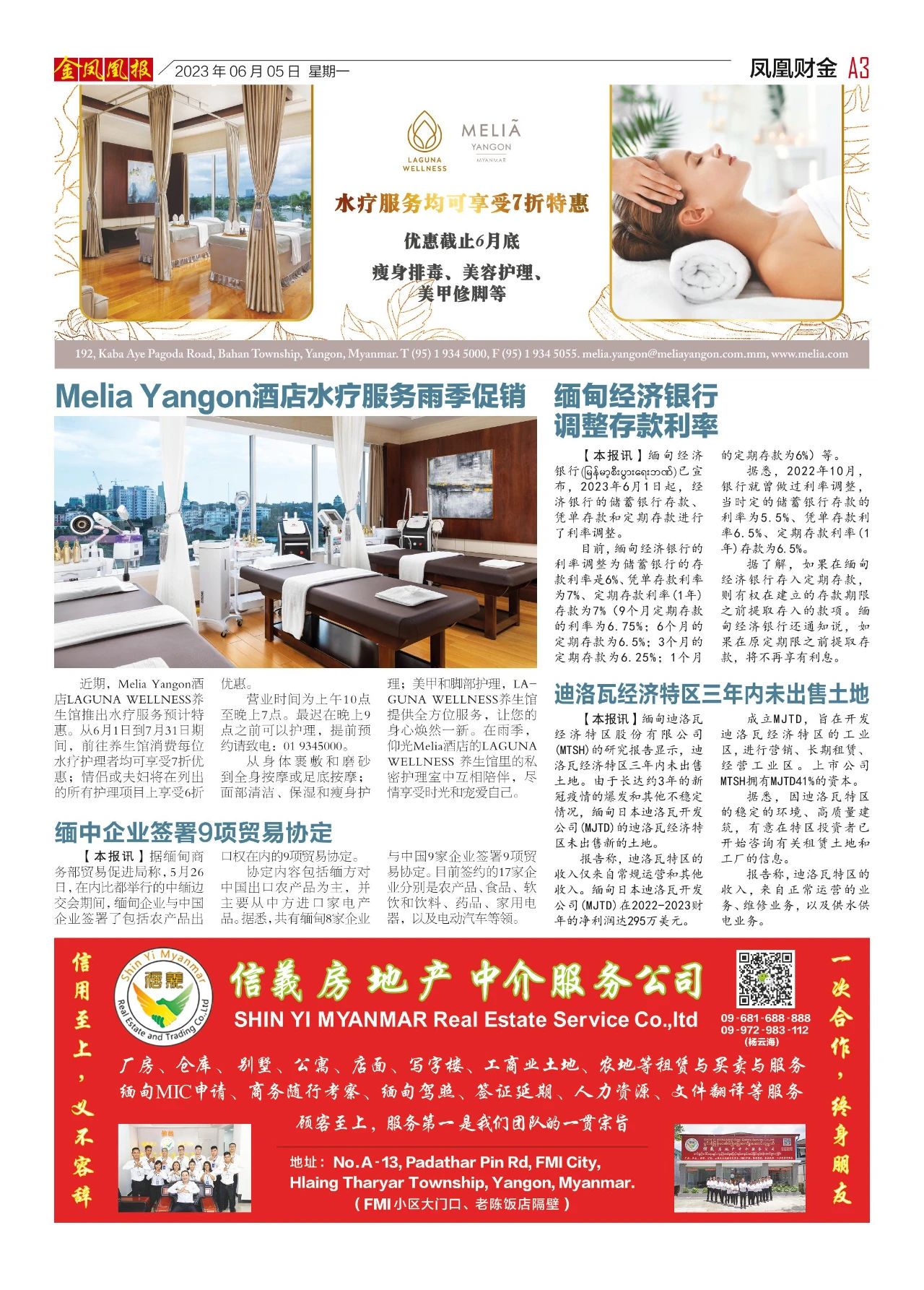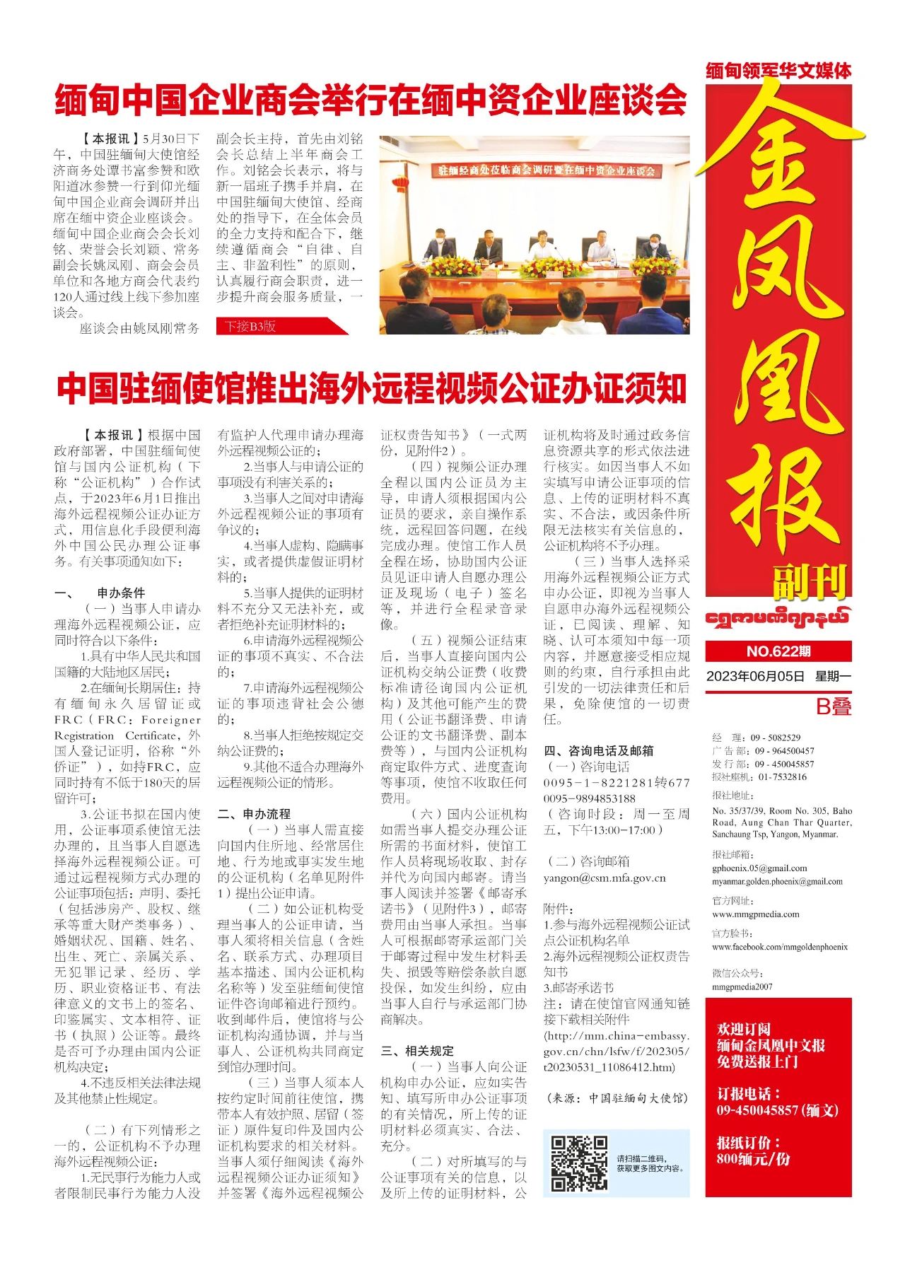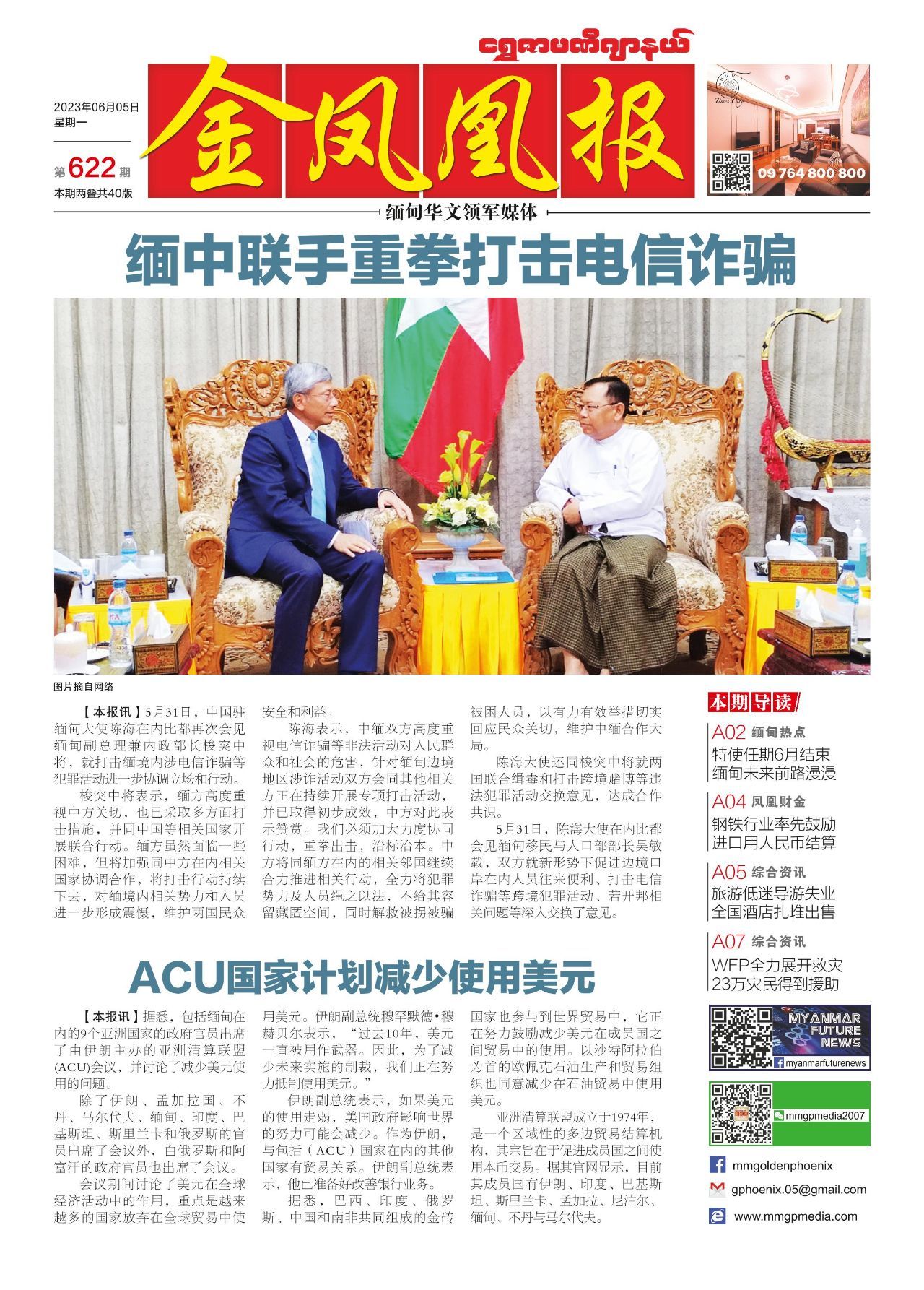 各位《金凤凰报》的知音,我们又通过声音和您相会,本周“声音周刊”将为您带来“缅中联手重拳打击电信诈骗”“钢铁行业鼓励进口人民币结算”以及旅游低迷影响蔓延一周重点新闻资讯。2023年6月5日出版的第622期《金凤凰报》电子报同时发送,为您带来关于缅甸最新最全的资讯。