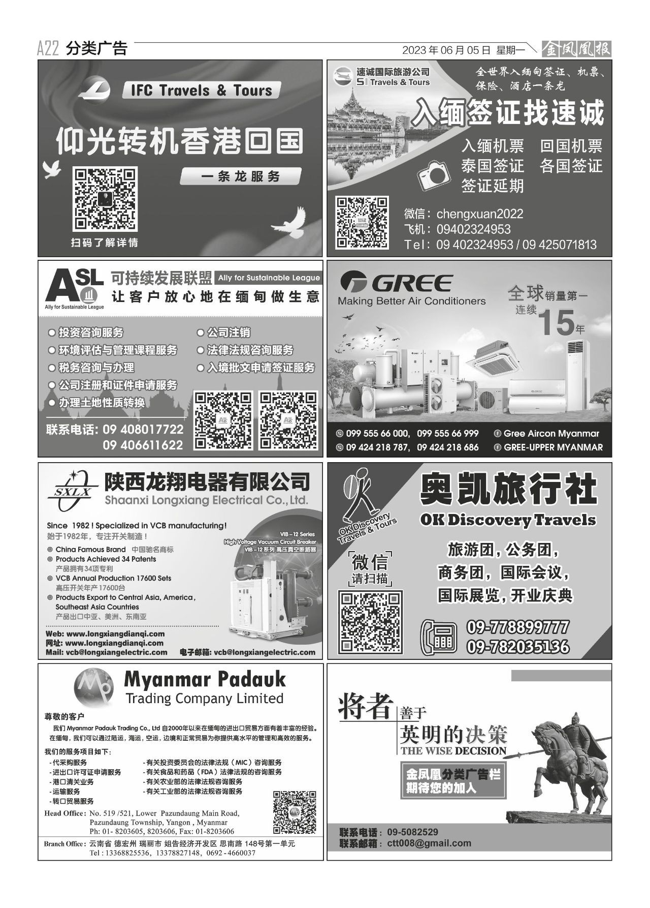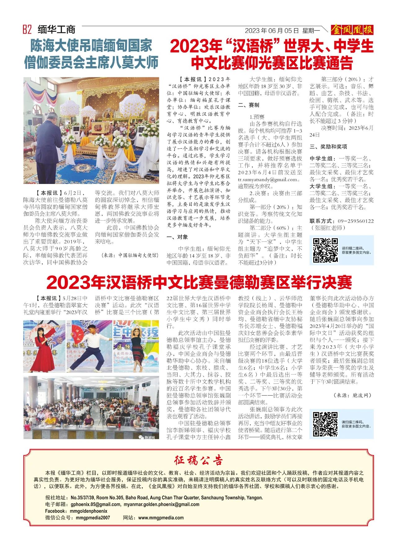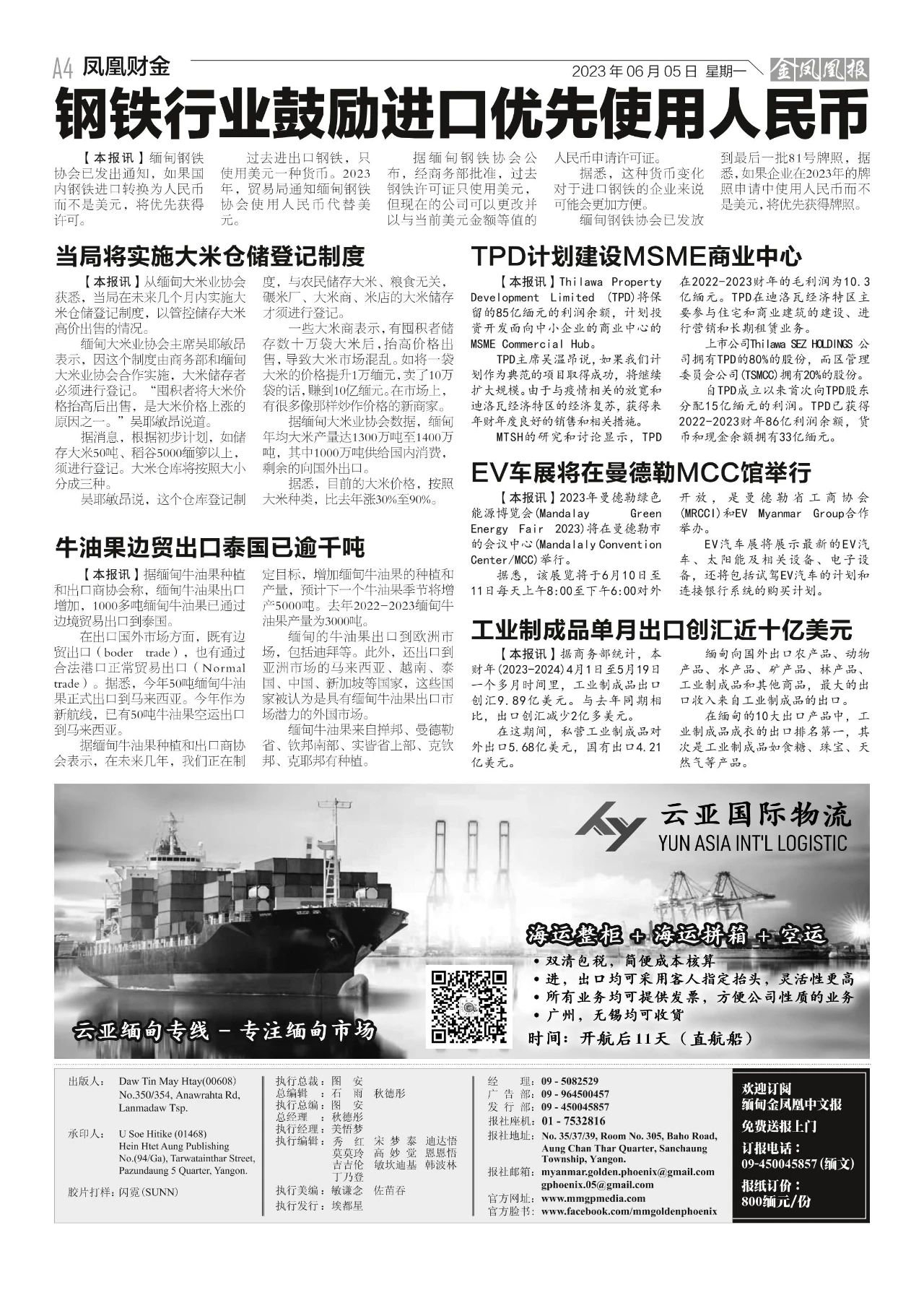 各位《金凤凰报》的知音,我们又通过声音和您相会,本周“声音周刊”将为您带来“缅中联手重拳打击电信诈骗”“钢铁行业鼓励进口人民币结算”以及旅游低迷影响蔓延一周重点新闻资讯。2023年6月5日出版的第622期《金凤凰报》电子报同时发送,为您带来关于缅甸最新最全的资讯。