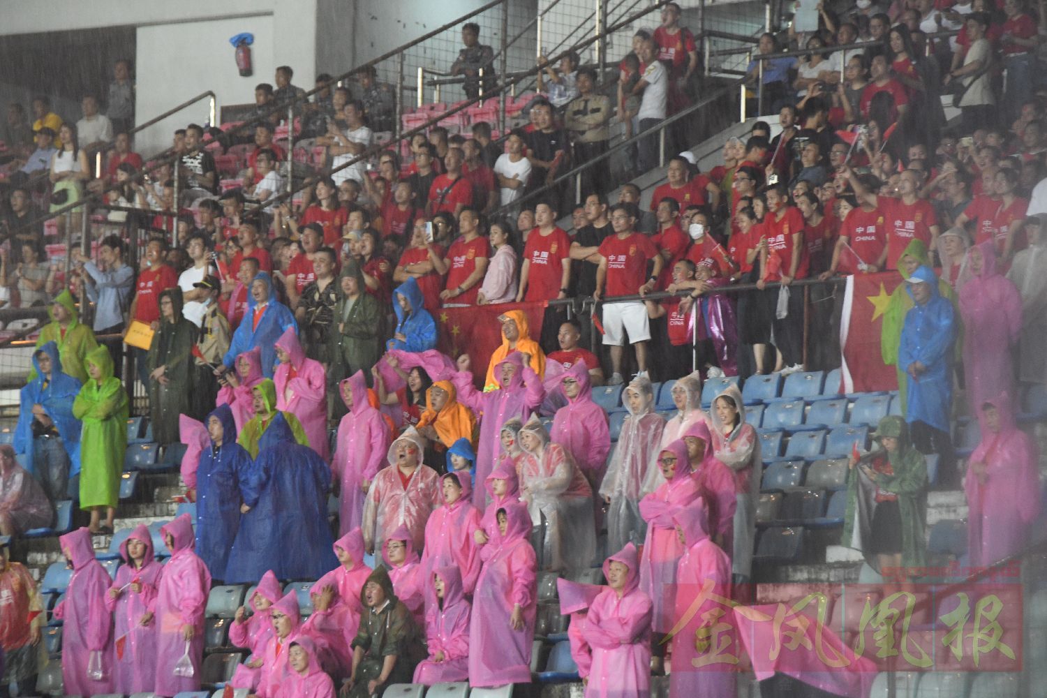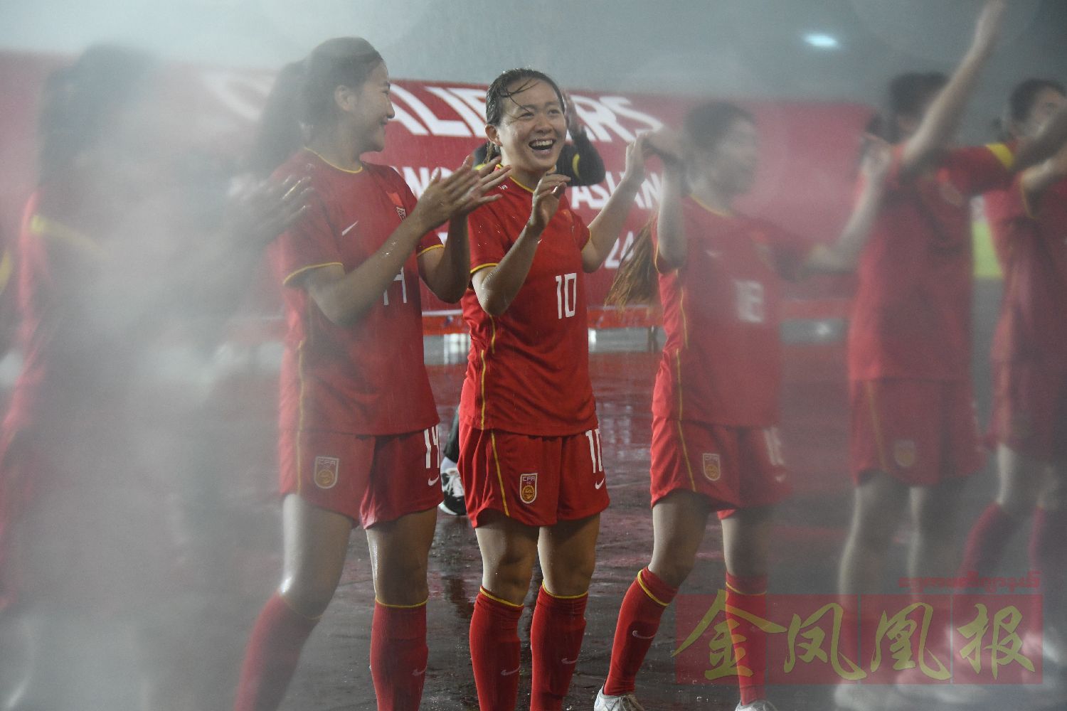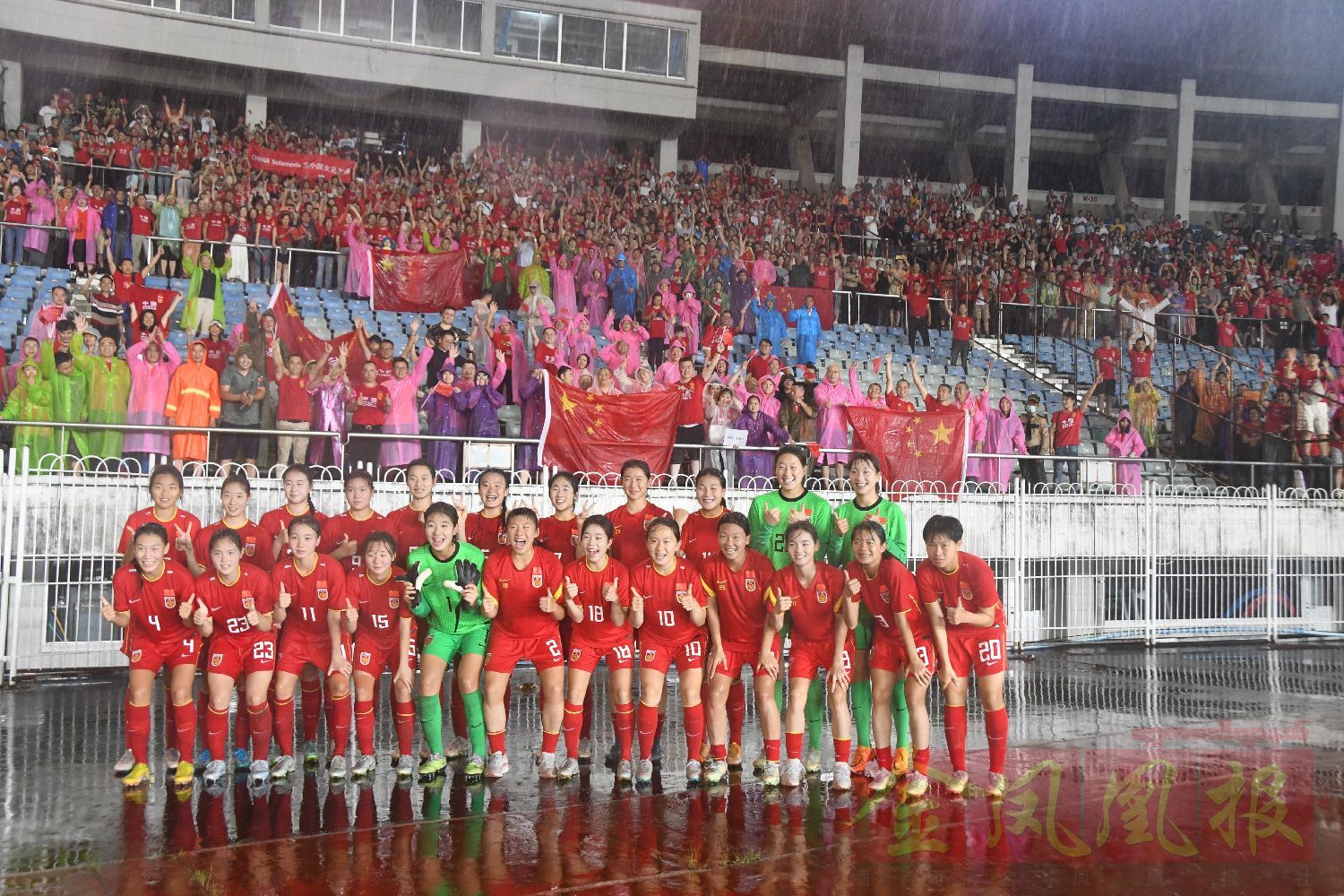 现场看台红旗飘扬,加油助威声此起彼伏“中国队加油”响彻球场。赛后,女足姑娘们手拉手向在场冒雨坚持助威全场的球迷致以谢意。