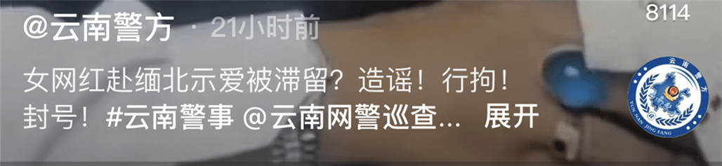 【缅甸金凤凰讯】据中国云南省公安厅“云南警方”日前发布消息,有两位“网红”为博取眼球,直播时编排“女网红赴缅甸北示爱被滞留”等话题引发全网关注和热议。随后,经中国公安机关等有关部门核查证实是造谣,目前两位涉事“网红”已被批捕刑拘,相关账号被封号。