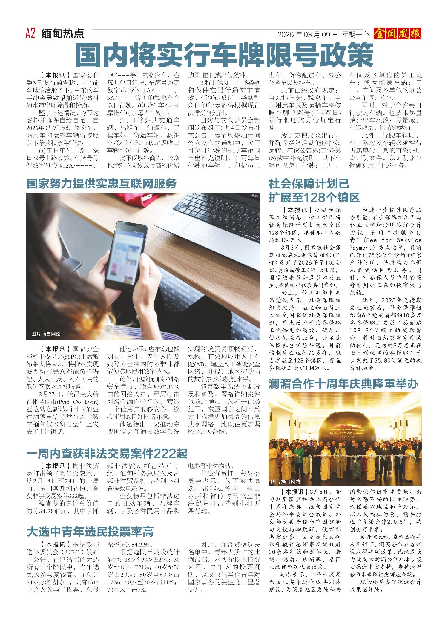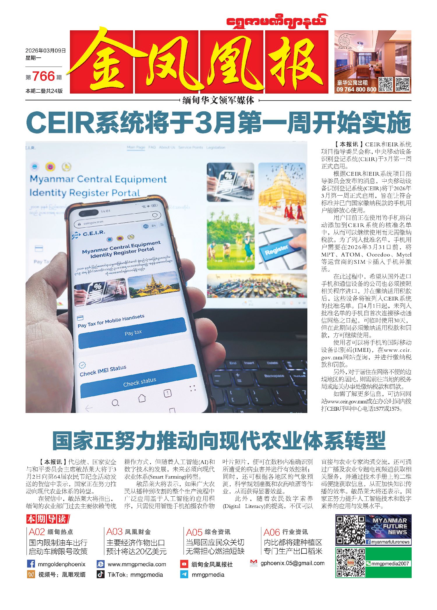 各位《金凤凰报》的知音,我们又通过声音和您相会,本周“声音周刊”将为您带来使用手机须登记审核、缅甸发展现代农业以及油车按车牌限号等一周重点新闻资讯。2026年3月9日出版的第766期《金凤凰报》电子报同时发送,为您带来关于缅甸最新最全的资讯。