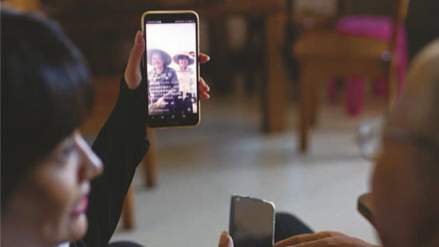 郑露婷和父亲在陇石村家中翻看早期拍摄的抖音视频,父亲当时还不习惯镜头,如今看到相机会主动微笑打招呼。